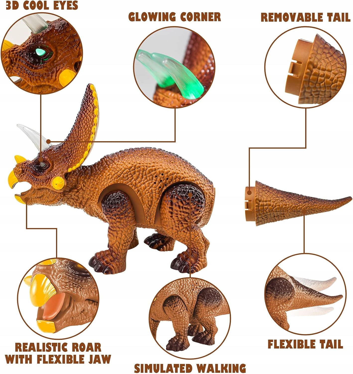 Динозавр был оснащен световыми эффектами и sound . освещенные глаза , и углы , реалистичный рев и звук тяжелых шагов предстоящего динозавра усиливают впечатления во время игры с динозавром. Благодаря светодиодам, помещенным в глаза, и в углах это выглядит великолепно также в темноте.