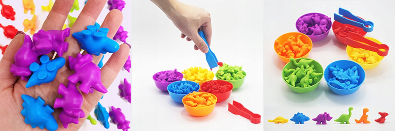 ✔ With the help of a tweezers, the child grabs and moves dinosaurs to individual bowls, sorting according to matching the color of a dinus with the color of the bowl