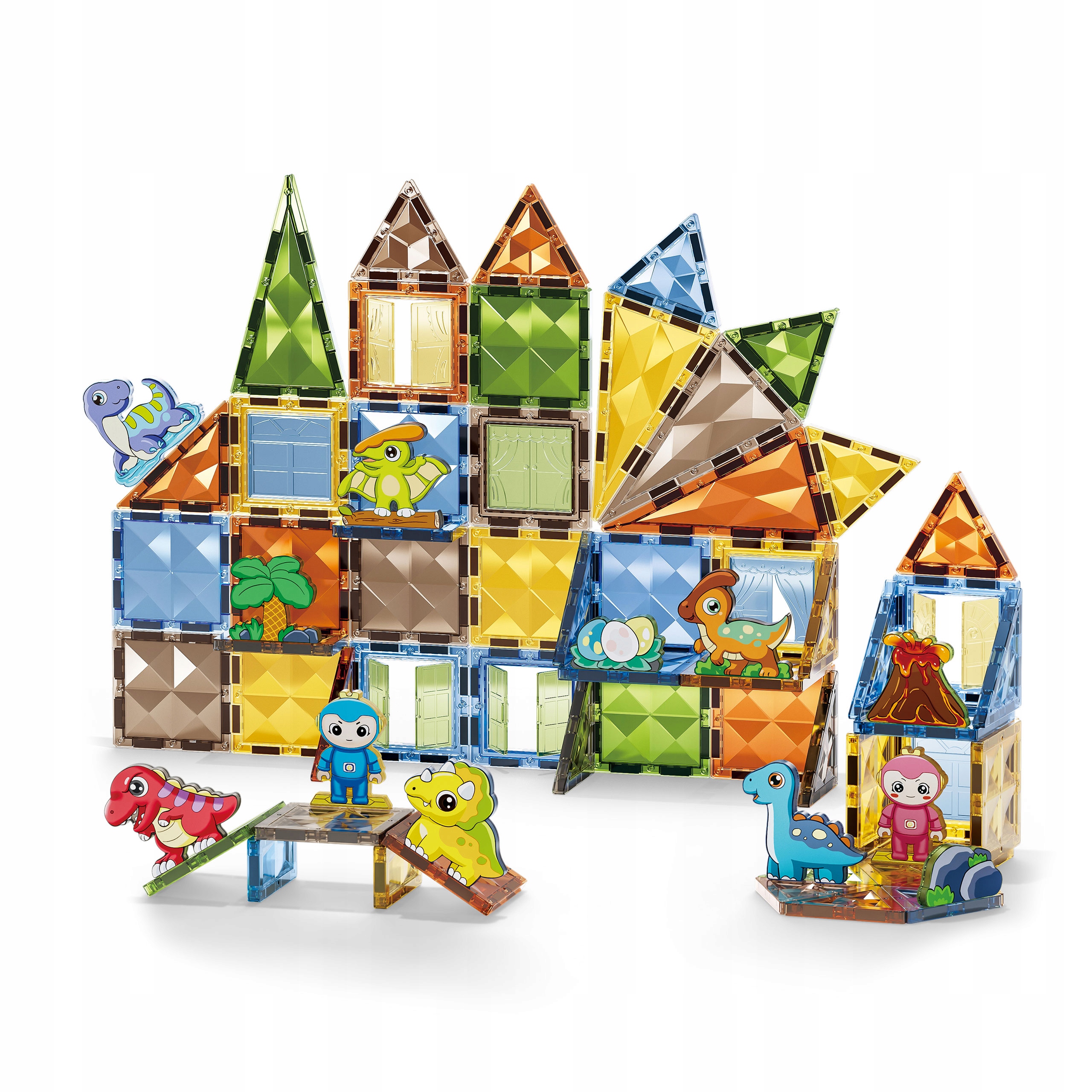 Играйте с блоками, которые они представляют собой светлые, твердые и легко подключаются друг к другу благодаря встроенным магнитам, что позволяет детям строить новые конструкции - от башен и домов до замков и ферм. На съемочной площадке вы найдете много красочных динозавров и декоративных элементов, которые позволят вам создать настоящий доисторический рай.