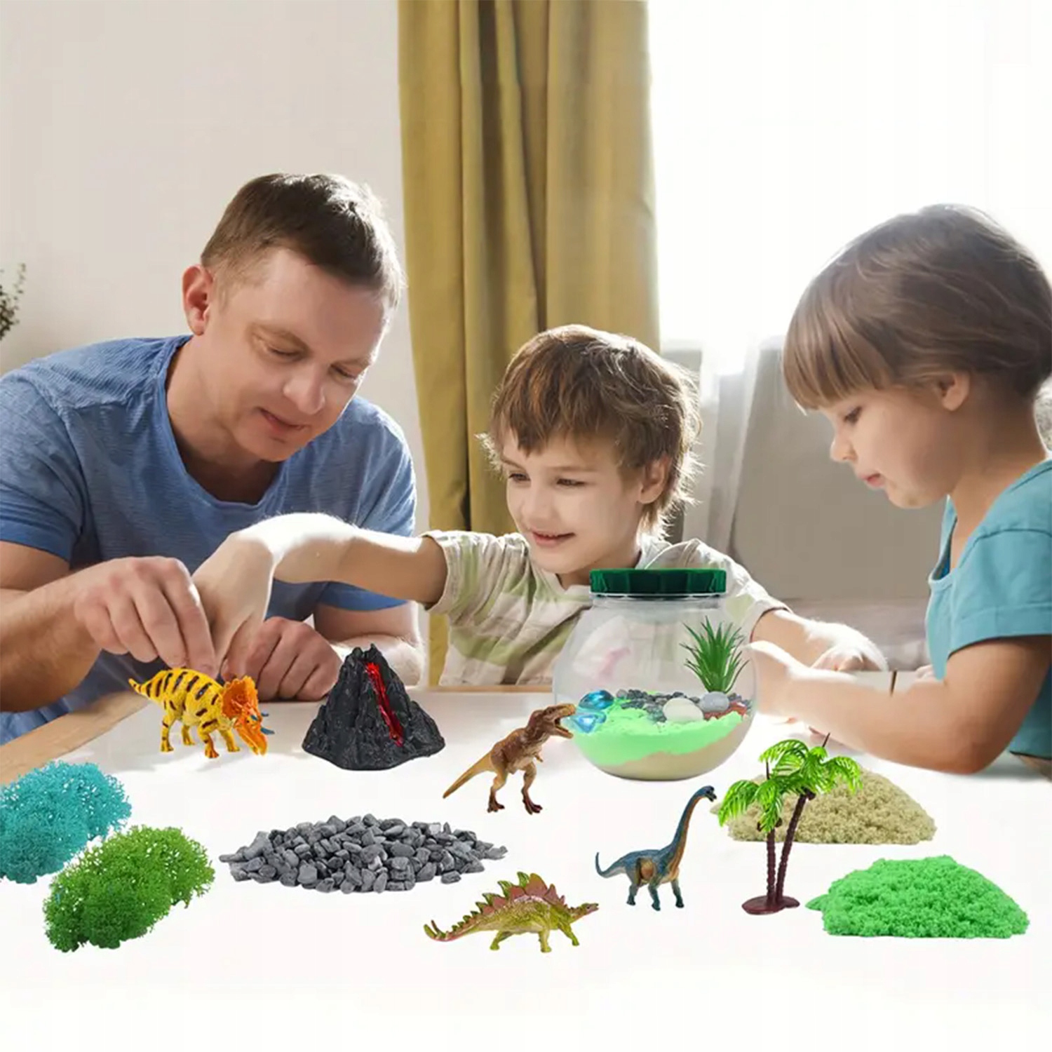 - ✔️В комплект входят волшебный песок, мох, светодиодная лампа с пультом дистанционного управления, миниатюрные модели динозавров, миниатюрные модели деревьев, миниатюрная модель вулкана и другие декоративные аксессуары.