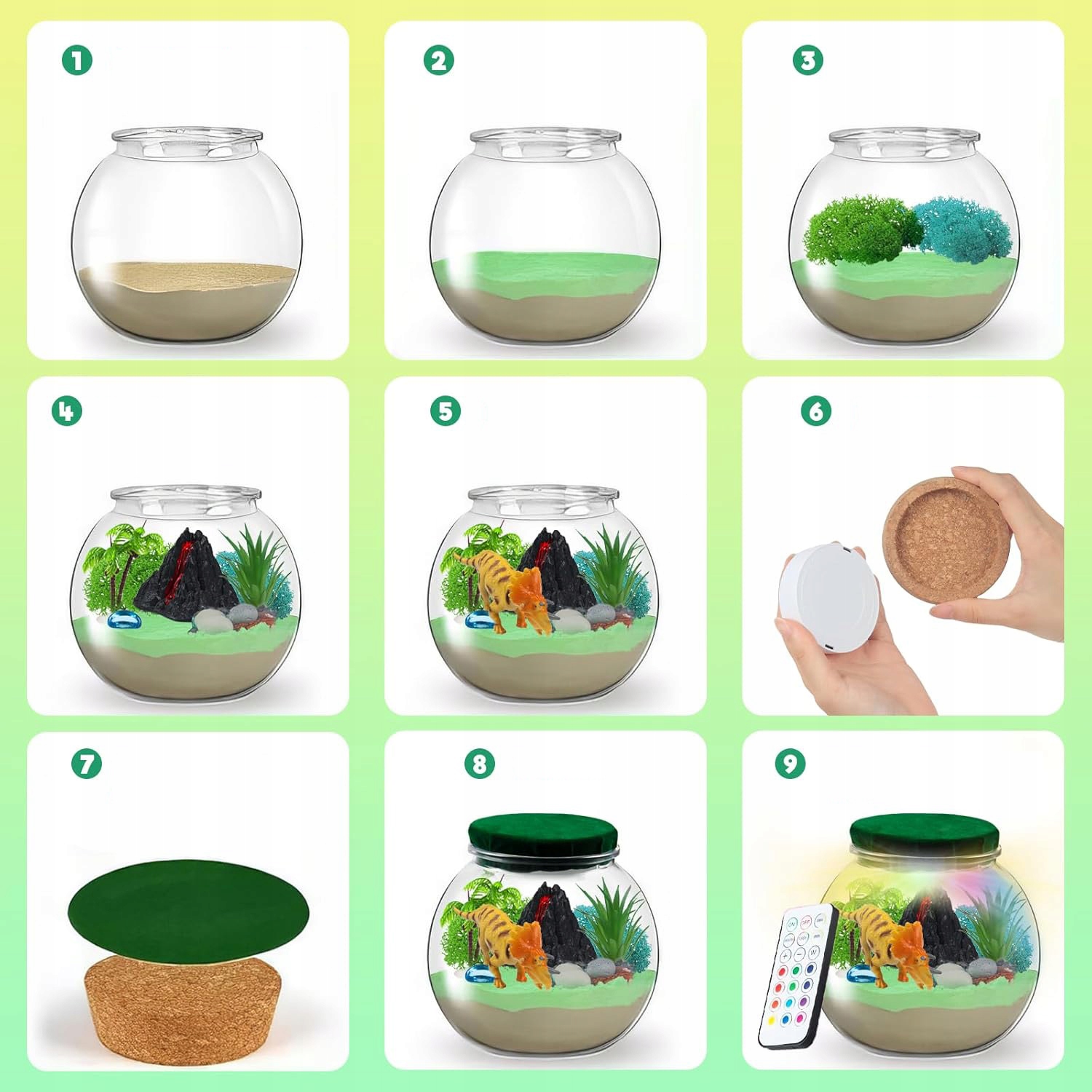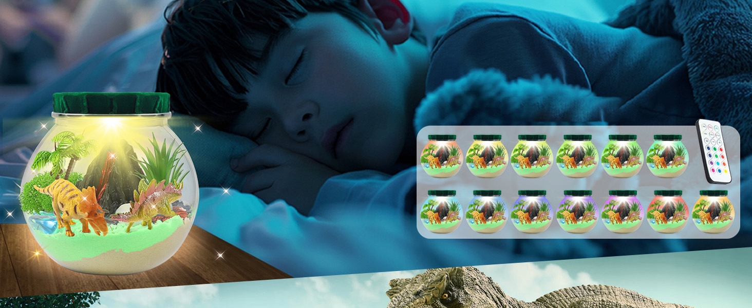 В этот набор динозавров входят волшебный песок, консервированный мох, 12-цветный светодиодный ночник с дистанционным управлением, миниатюрный динозавр, миниатюрное дерево, миниатюрный вулкан и декоративные аксессуары. Милый арт-проект для детей.