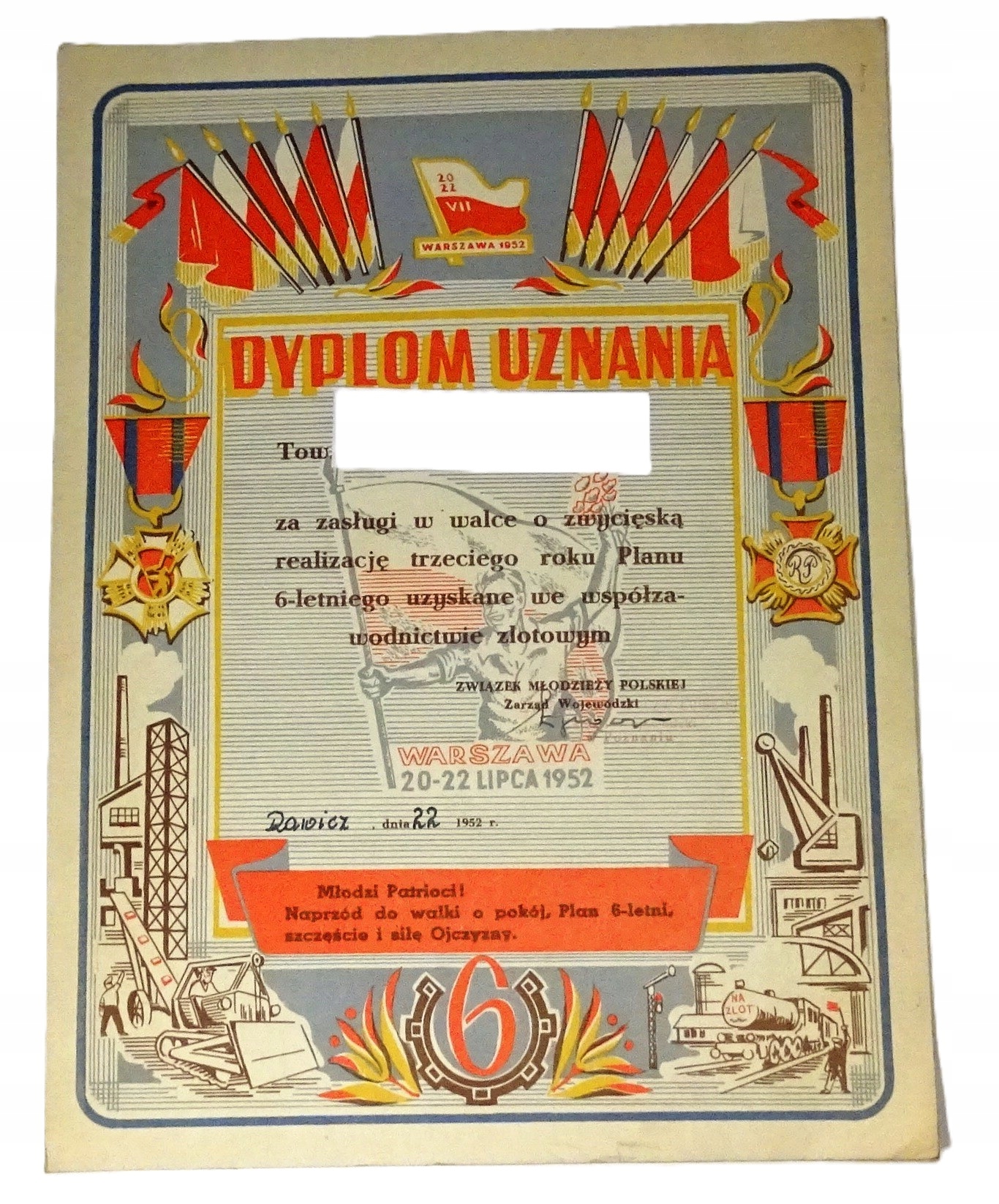 Диплом ПНР 22 Липня 1952 План 6 річний - Равич