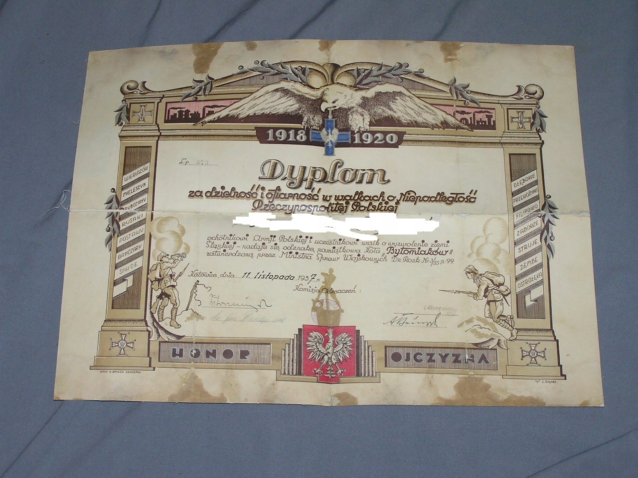 ДИПЛОМ ЗА ХРАБОСТЬ И... ПАМЯТНЫЙ ЗНАК КАТОВИЦЕ 1937 ГОДА ПОД БЫТОМОМ....