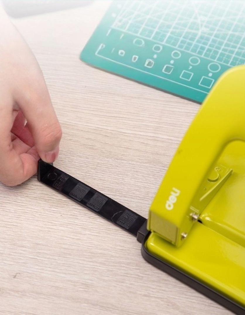 Дырокол оснащен выдвижной линейкой с разметкой ➡️, благодаря которой вы легко сможете установить центр документа – независимо от его формата. Эта система позволяет добиться идеального баланса каждого среза ✅. Кроме того, встроенный контейнер для обрезков ♻️ облегчает поддержание порядка на рабочем месте ✒️.