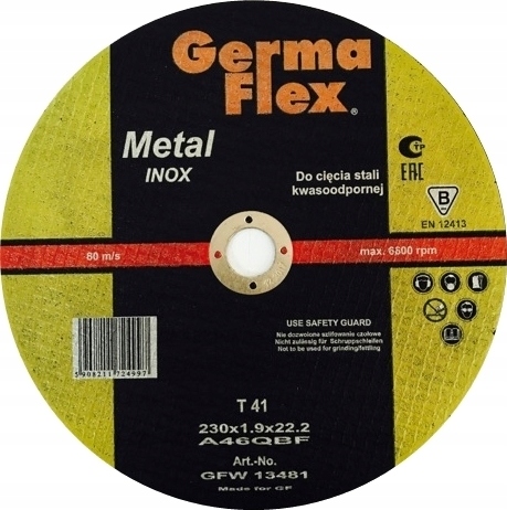 Металлические диски имеют абразив на связке синтетической смолы и армированы стеклотканью. Чрезвычайно прочные абразивные зерна из оксида алюминия обеспечивают высокую производительность резки металла и продлевают срок службы инструмента. Диски предназначены для быстрой резки элементов из конструкционной стали, листового металла, труб и профилей. Чрезвычайно тонкие диски INOX толщиной 1,9 мм предназначены для быстрой резки тонких листов и тонкостенных профилей.