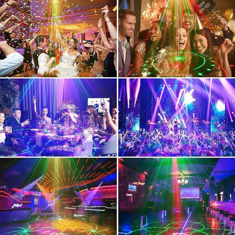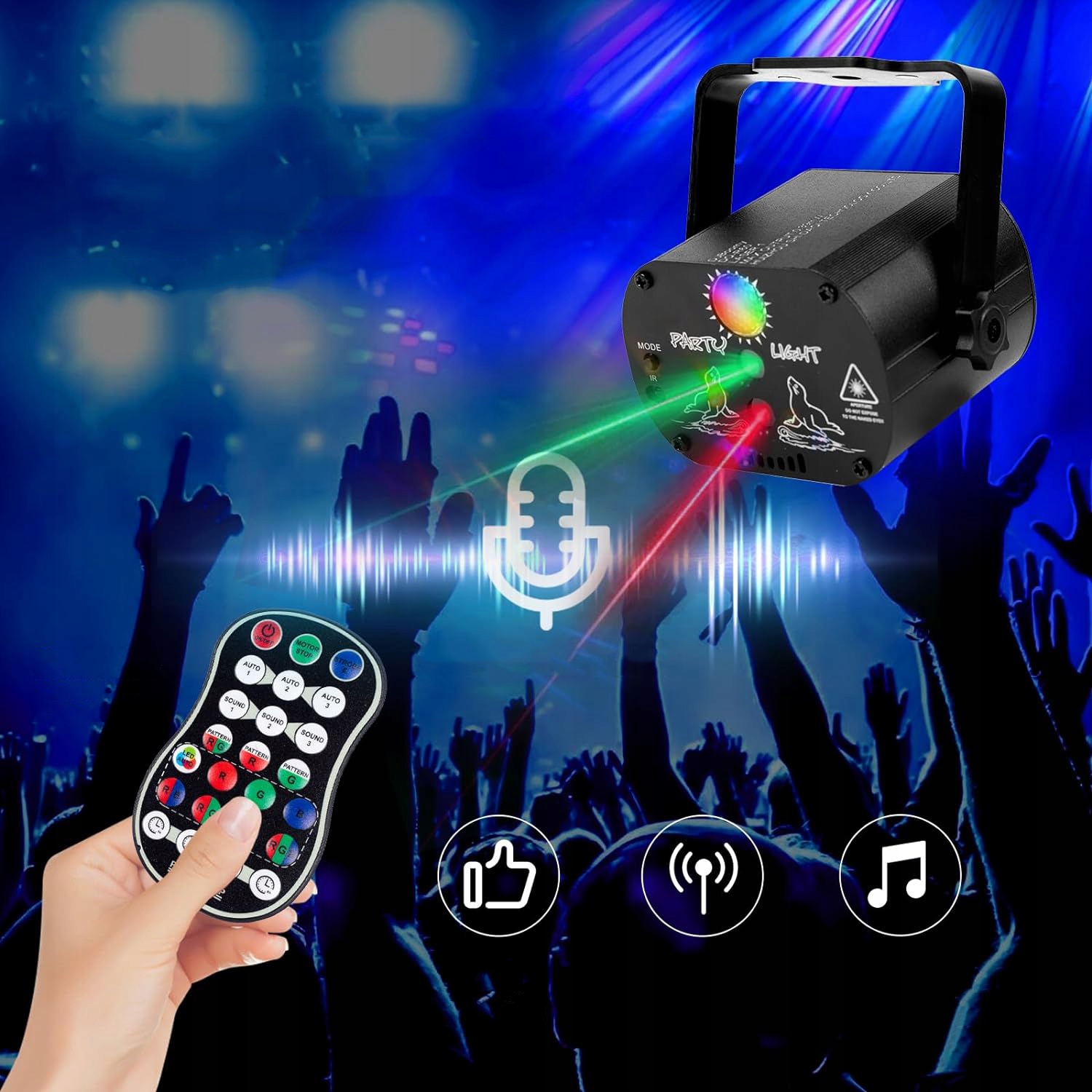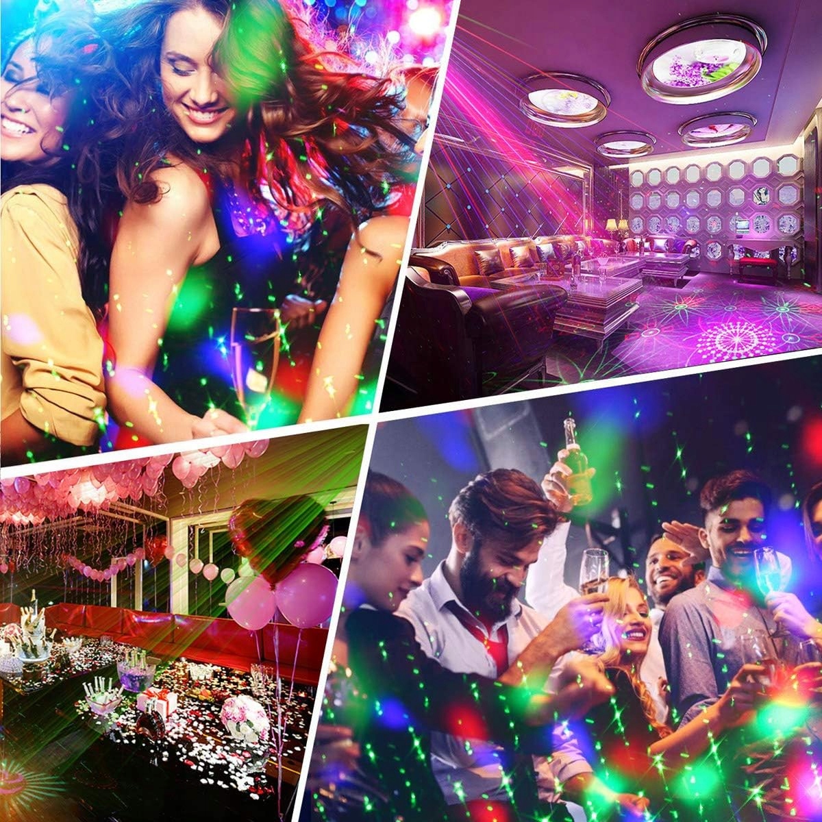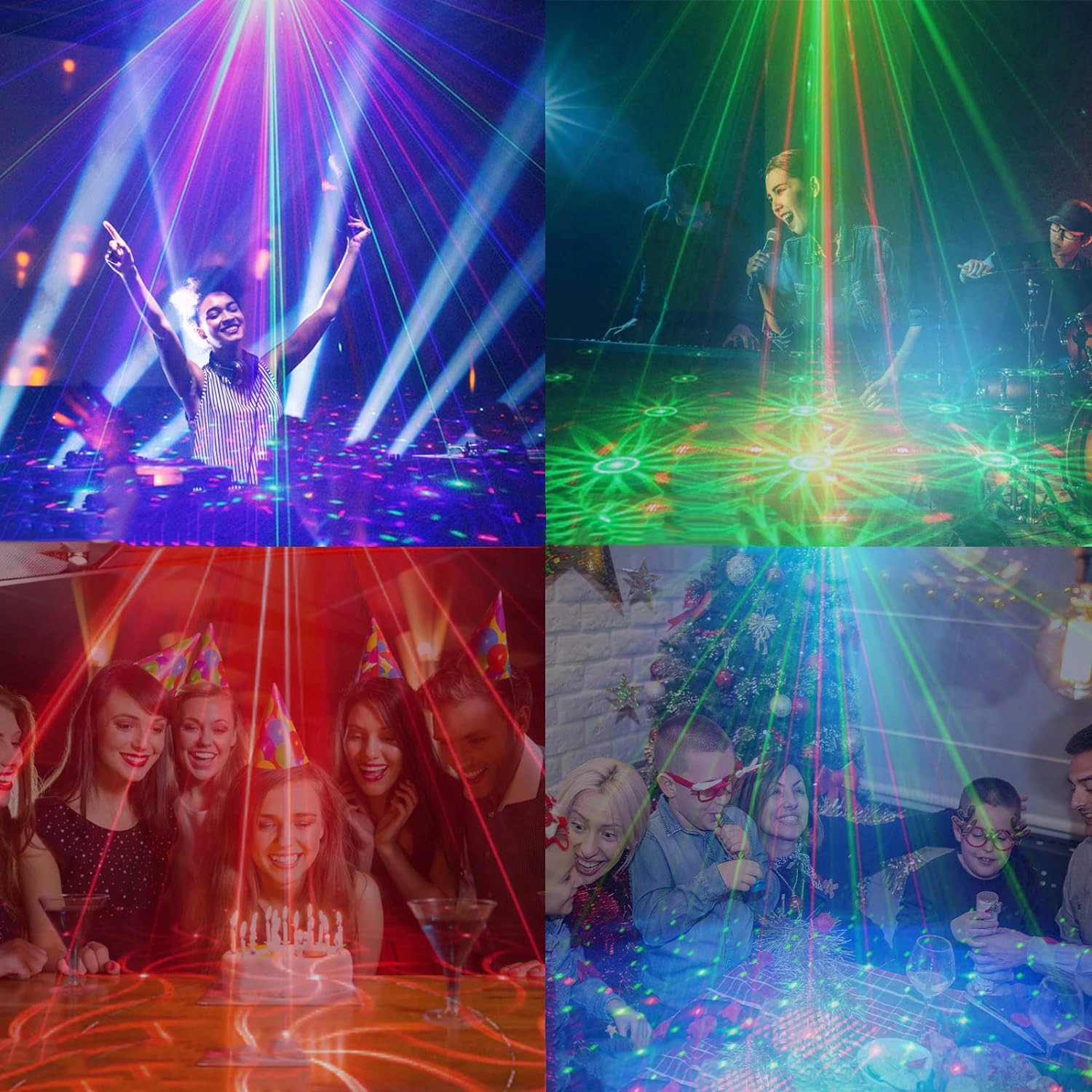 Усовершенствованные лазерные фонари для вечеринок, способные создавать 90 комбинаций изображений, 7 цветовых фонов (красный, зеленый, синий, красный и зеленый, красный и синий, синий и зеленый, красный и синий и зеленый) и 3 комбинации лучей (зеленый, красный, зеленый и красный), создавая более чудесная атмосфера сцены благодаря сочетанию многофункциональных эффектов и высококачественной проекции.