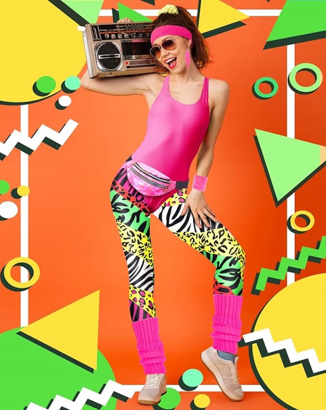 Этот наряд в ярком неоновом ретро-стиле идеально подходит для тематических вечеринок, фитнес-занятий в стиле 80-х или спортивных мероприятий!