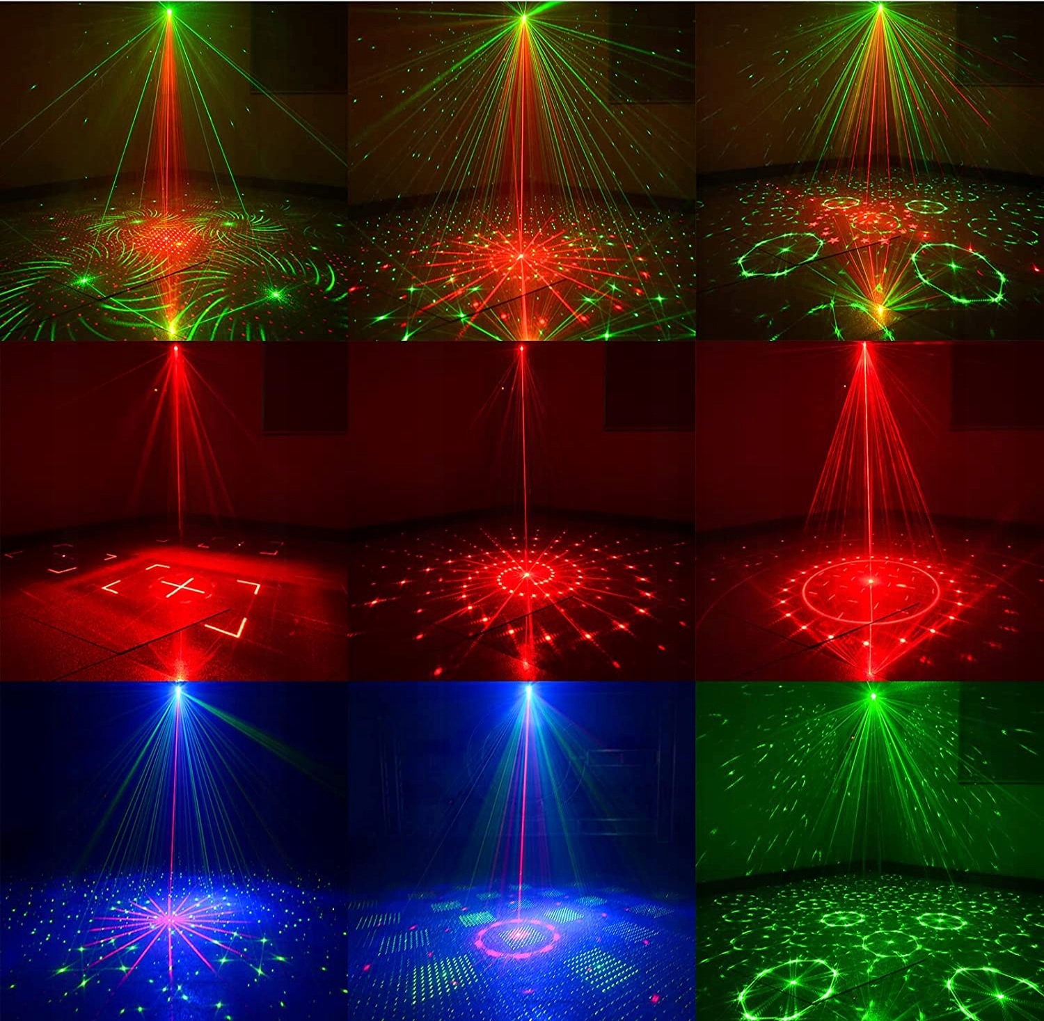 - ② Многофункциональное освещение для вечеринокe: Стробоскопический свет имеет 8 источников света (красный и зеленый и светодиодная подсветка), 240 узоров, цвет и скорость меняются в зависимости от ритма звука/музыки. Удивительная комбинация делает ночь более красочной.
