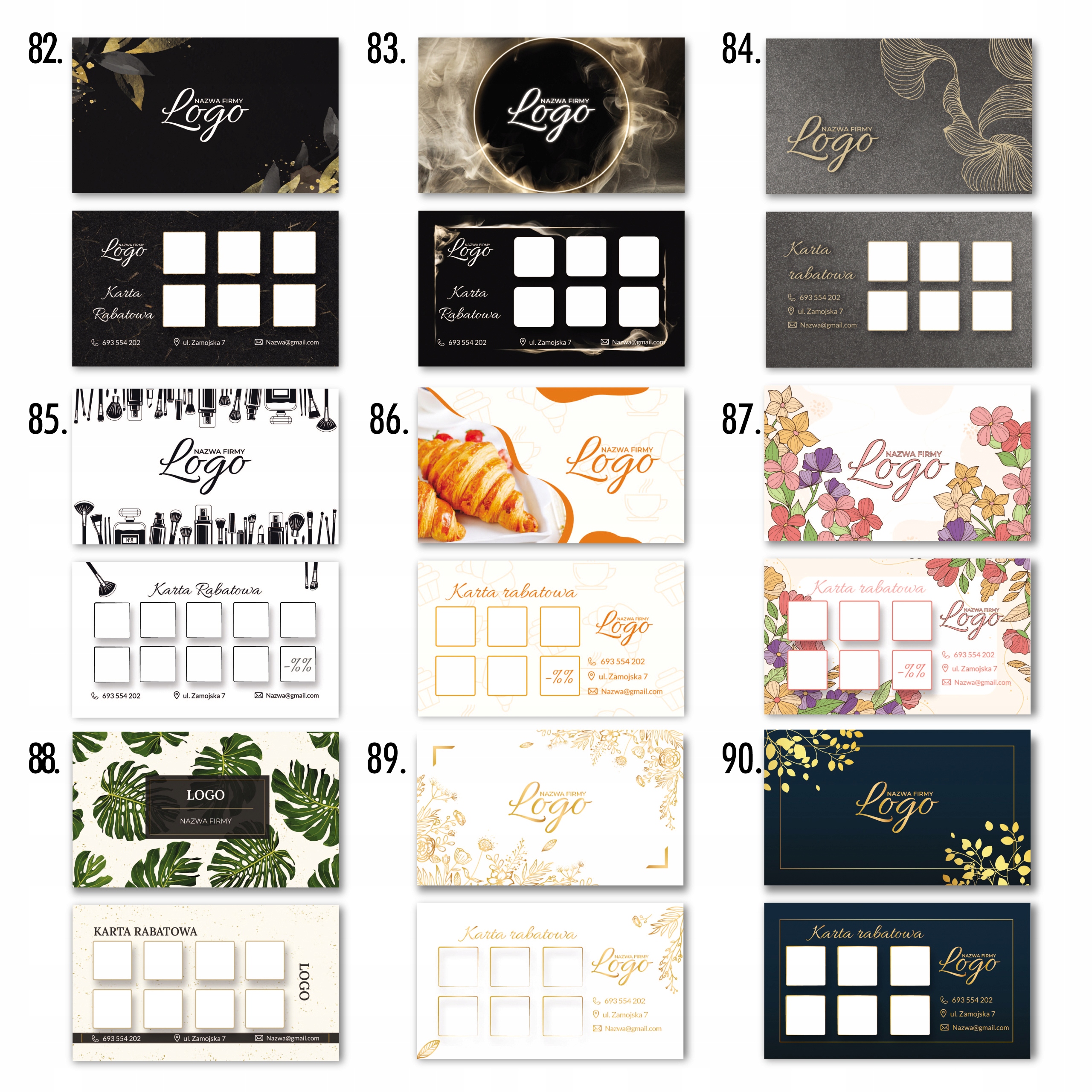 Сначала выберите дизайн карточки, затем разместите логотип и текст на первой странице. На второй странице вы можете изменить поля для штампов (количество, форма, цвет) и изменить значки (телефон, контакт, местоположение, сайт, социальные сети).