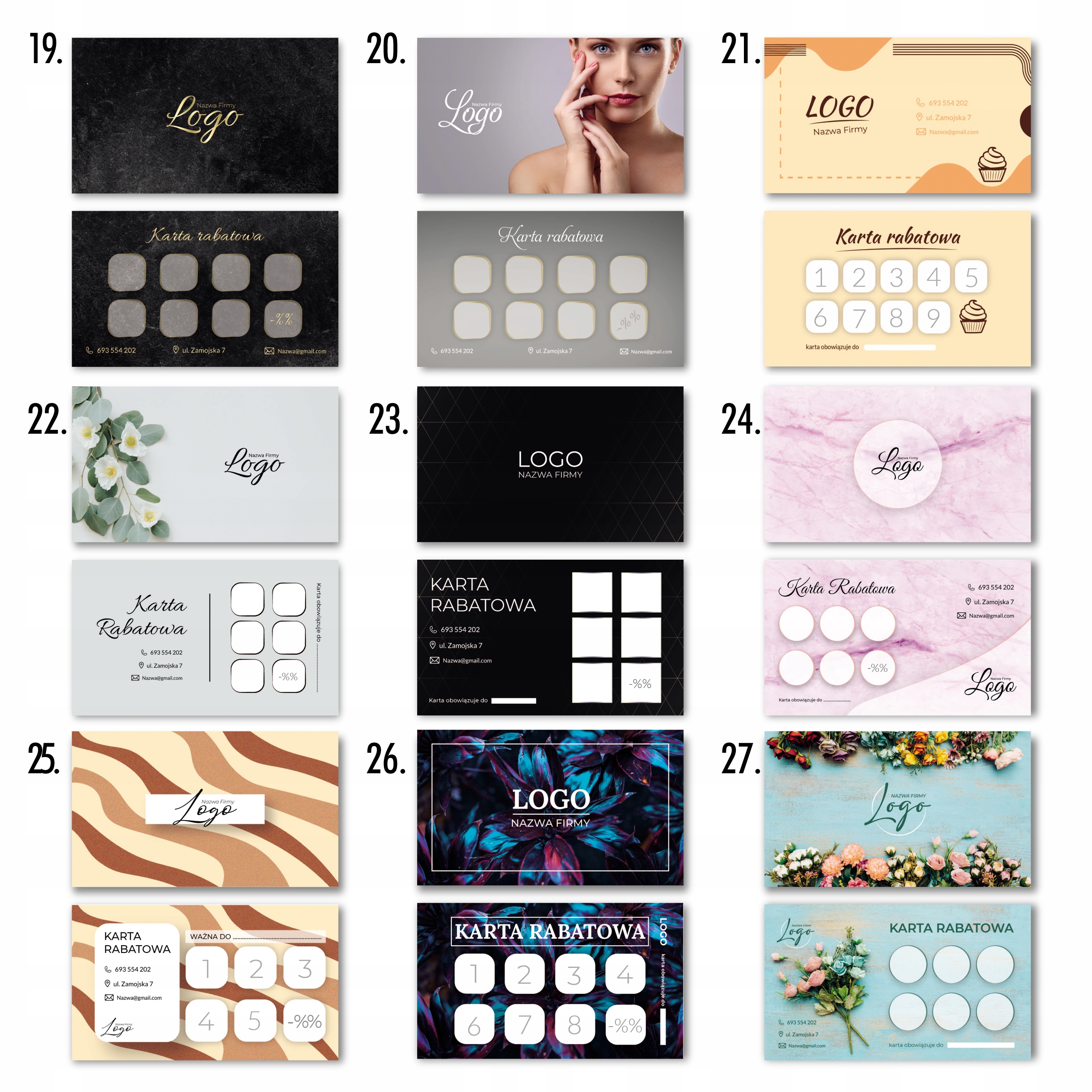 Сначала выберите дизайн карточки, затем разместите логотип и текст на первой странице. На второй странице вы можете изменить поля для штампов (количество, форма, цвет) и изменить значки (телефон, контакт, местоположение, сайт, социальные сети).
