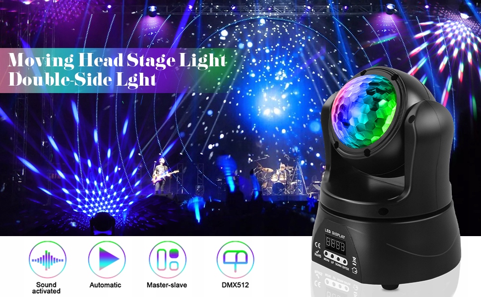 【Двухсторонняя конструкция световой головки】Обычные движущиеся головные светильники имеют только одну световую проекционную поверхность, наша вечеринка светильники излучают свет с обеих сторон и имеют разные световые эффекты: на передней стороне виден большой блок-луч, а на задней - точечный свет. Добавьте больше световых эффектов на сцену с помощью этой подвижной фары.