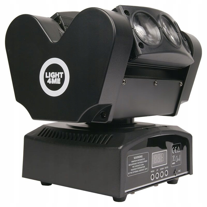 Light4me Spider Head 6x10 имеют вход и вывод XLR для управления этим диско -освещением с использованием протокола DMX. Панель управления с цифровым дисплеем и четырьмя кнопками управления позволяет легко изменить настройки в меню, а также выбирать один из четырех режимов, представляющих интерес для нас: