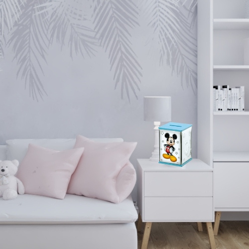 Копилка с одной стороны украшена изображением диснеевского Микки Мауса в красных шортах, а с другой стороны копилки нежными, детскими мотивами в виде звездочек, букв и сердечек, которые дополнительно придают копилка очаровательный, детский персонаж.