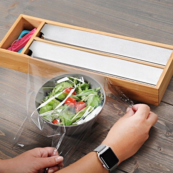 Диспенсер для пищевой фольги Kesper оснащен двумя отделениями с удобной функцией резака пищевой фольги и дополнительным отделением для мелких предметов, таких как скрепки, резинки и т.п. Вставка ящика изготовлена из бамбукаа, что идеально подходит для кухни и при этом красиво выглядит.