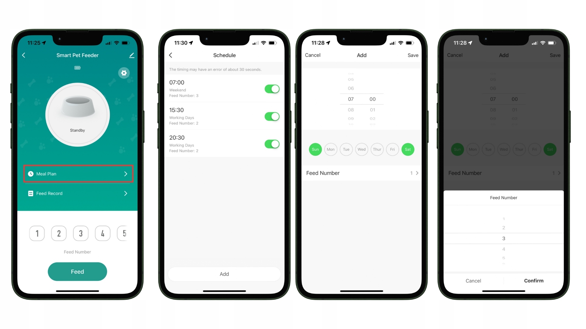 <р>1. Выберите План питания на главном экране диспенсера. <р>2. Добавить новый график приема пищи. Нажмите кнопку «Добавить» в нижней части экрана, чтобы начать создавать новый график приема пищи для вашего питомца. <р>3. Выбрать время кормления — установите точное время подачи еды, благодаря чему ваш питомец всегда будет получать еду в нужное время. <р>4. Выбрать дни недели. Укажите, в какие дни недели вы хотите, чтобы автомат подавал еду. Вы можете выбрать как отдельные дни, так и группы дней (например, только рабочие или выходные дни). <р>5. Установить количество порций. Выберите количество порций, которые вы хотите давать во время каждого кормления. Каждая порция составляет около 10 г еды, при этом за одно кормление можно установить от 1 до 12 порций, что позволяет регулировать количество еды под размер вашего питомца <р>6. Сохранить расписание. После установки времени, дней и количества порций нажмите кнопку Сохранить, чтобы сохранить расписание. Диспенсер теперь будет автоматически выдавать еду в соответствии с установленным графиком. <р>7. Добавьте больше расписаний. Если хотите, вы можете добавить больше расписаний кормления, создавая разные планы для разных дней или времени суток, чтобы идеально согласовать кормление с потребностями вашего питомца.Надежный источник питания для непрерывной работы