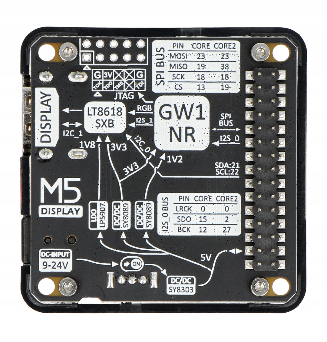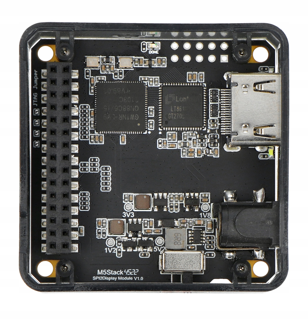 Display Module 13.2 — это расширение, созданное M5Stack и предназначенное для модулей разработки M5Stack Core и M5Stack Core2. Это модуль расширения HD-аудио и видео, в котором для вывода сигнала дисплея используется чип FPGA серии GAOYUN GW1NR. Он оснащен микросхемой формирования выходного сигнала LT8618S, которая поддерживает 24-битный вход RGB и до 8 входных аудиоканалов. Он также имеет встроенные системы преобразования напряжения, поэтому его можно питать напряжением от 9 В до 24 В.