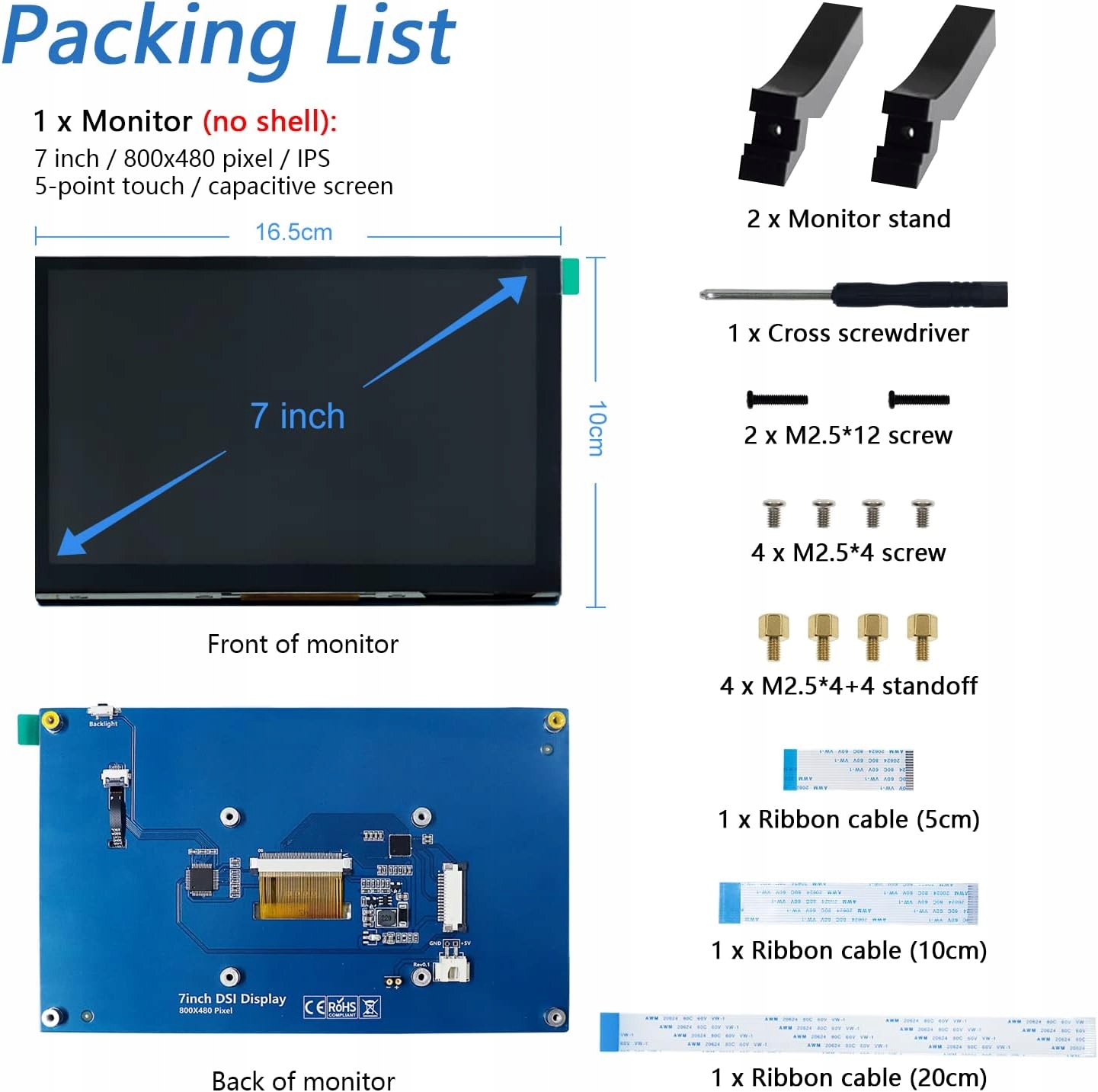 Вам просто нужно подключиться к порту DISPLAY вашей платы. (Другое подключение не требуется.) Совместимо с Raspberry Pi 4B/3B+/3B/3A+/2B/1B+/1A+. (Нет HDMI. Несовместимо с другими устройствами.) Параметры экрана -> 7 дюймов, 800х480 пикселей, широкий угол обзора IPS, 5-точечный емкостный сенсорный экран.