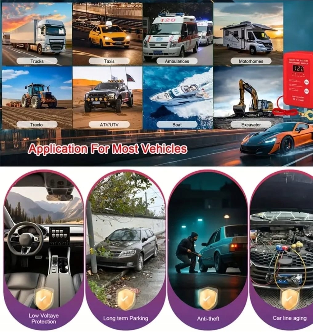 - Подходит для автомобильных систем 12 В и 24 В. 3. Автоматическое предупреждение о низком заряде батареи и автоматическое отключение батареи.
