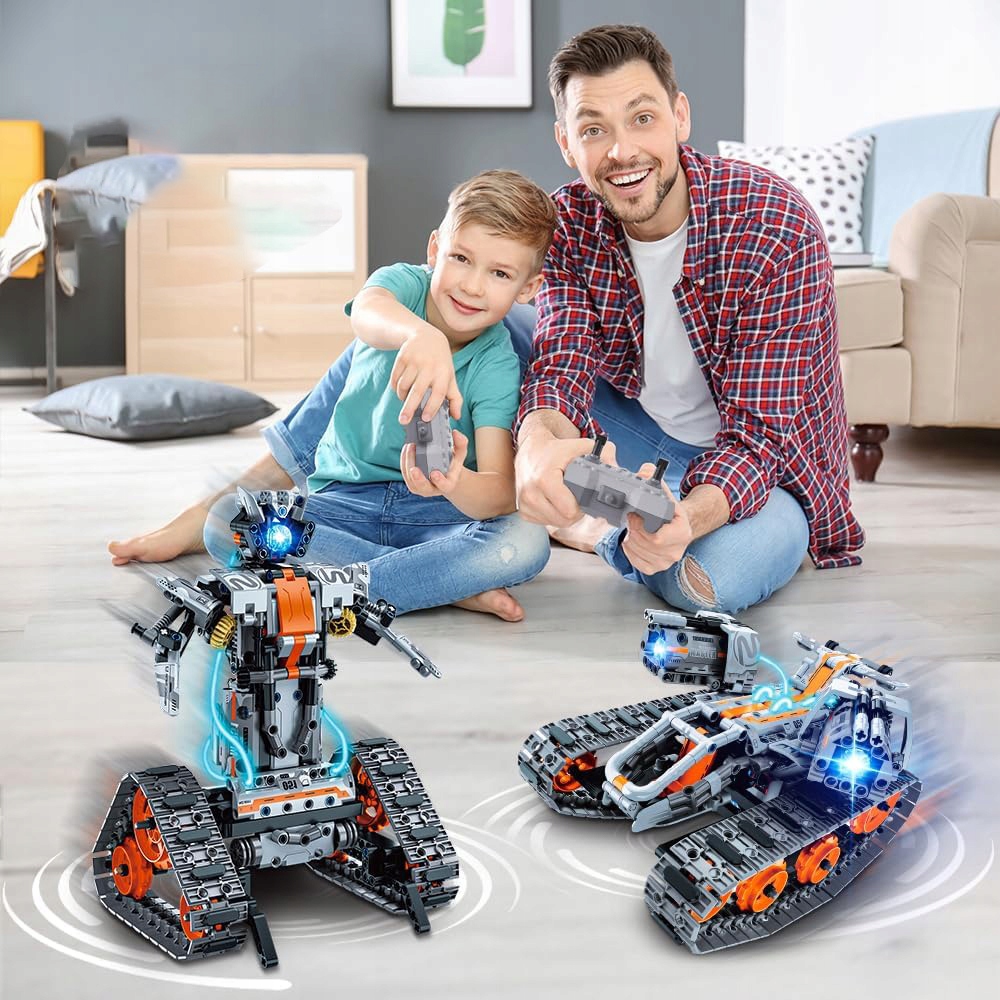 Этот набор технологических транспортных средств имеет как дистанционное управление 2,4 ГГц, так и функцию управления двойным приложением с 4 различными режимами: режим вождения, гравитационный датчик, режим пути и режим программирования. Просто загрузите бесплатное приложение, сканируя код на упаковке продукта или на фото