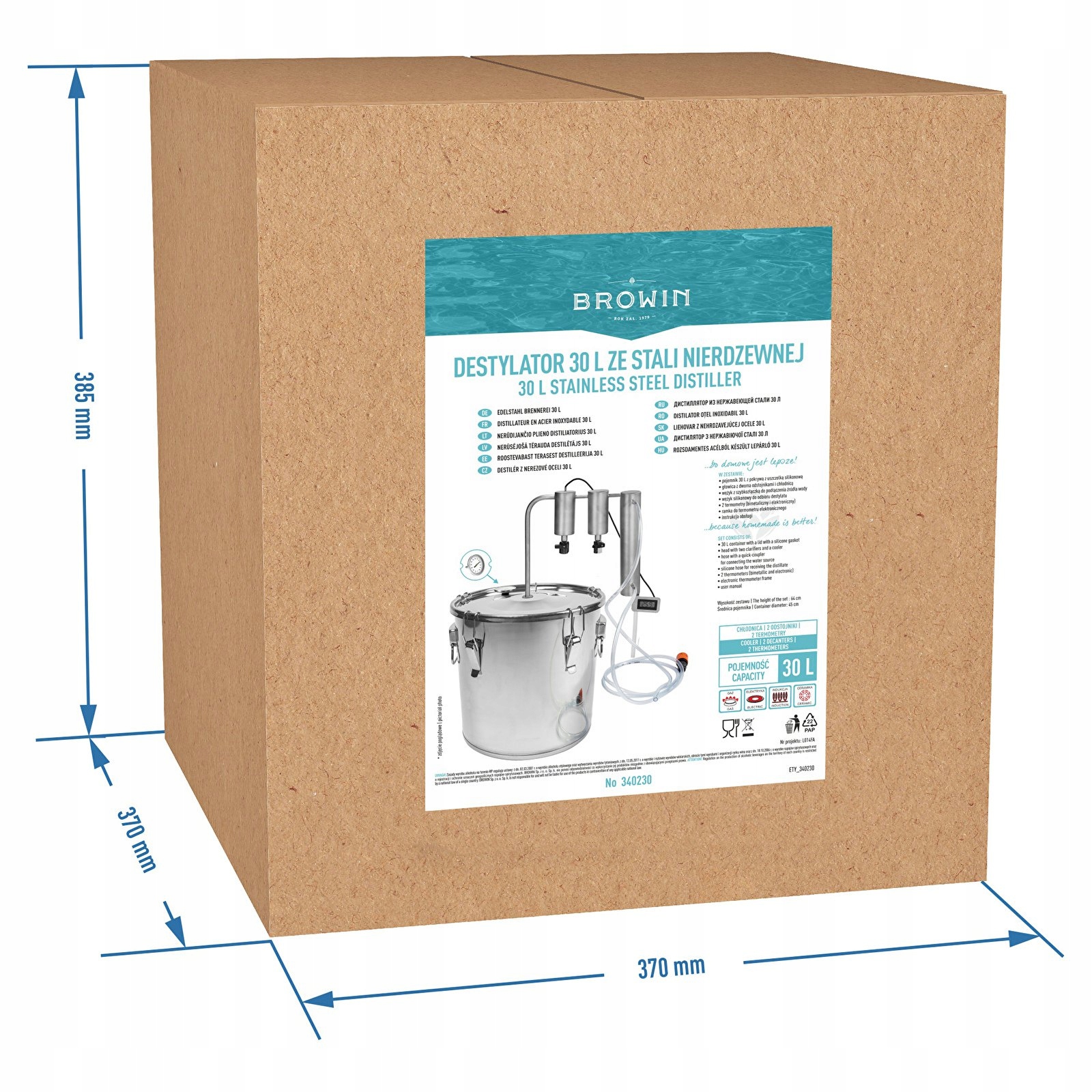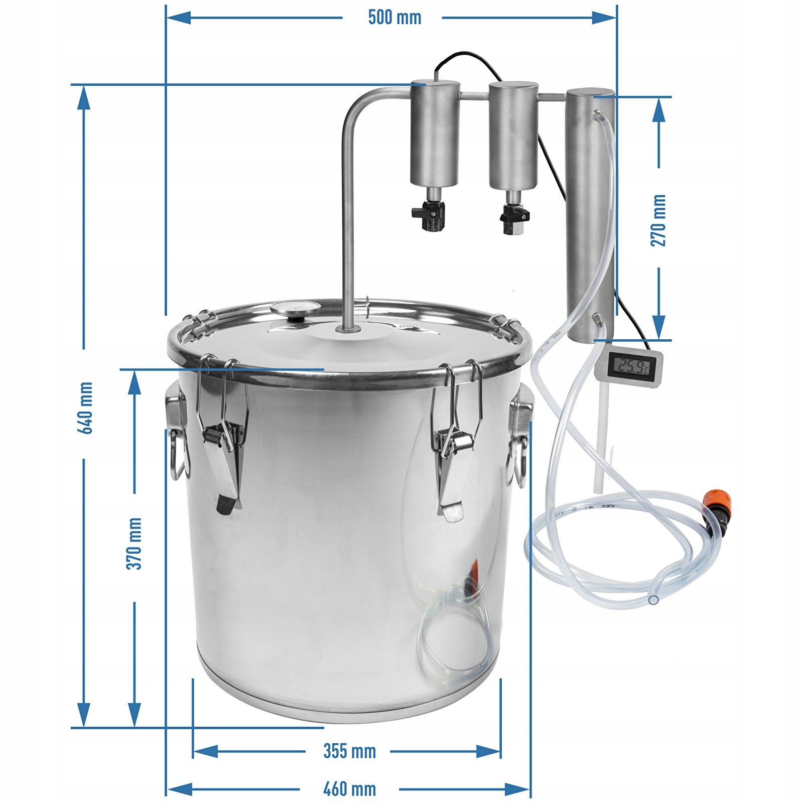 Наш дистиллятор оснащен емкостью 30 л. Контейнер оснащен двумя термометрами, позволяющими точно контролировать температуру. Аналоговый термометр, используемый для измерения температуры паров внутри контейнера, имеет погрешность +/- 1°C и представляет собой устройство, предназначенное для дистилляции. Электронный термометр, используемый для измерения температуры паров в отстойнике, имеет зонд из нержавеющей стали длиной 100 мм, диапазон температур: от -50°C до +110°C и питается от батареек: 2x LR44 (в комплекте).