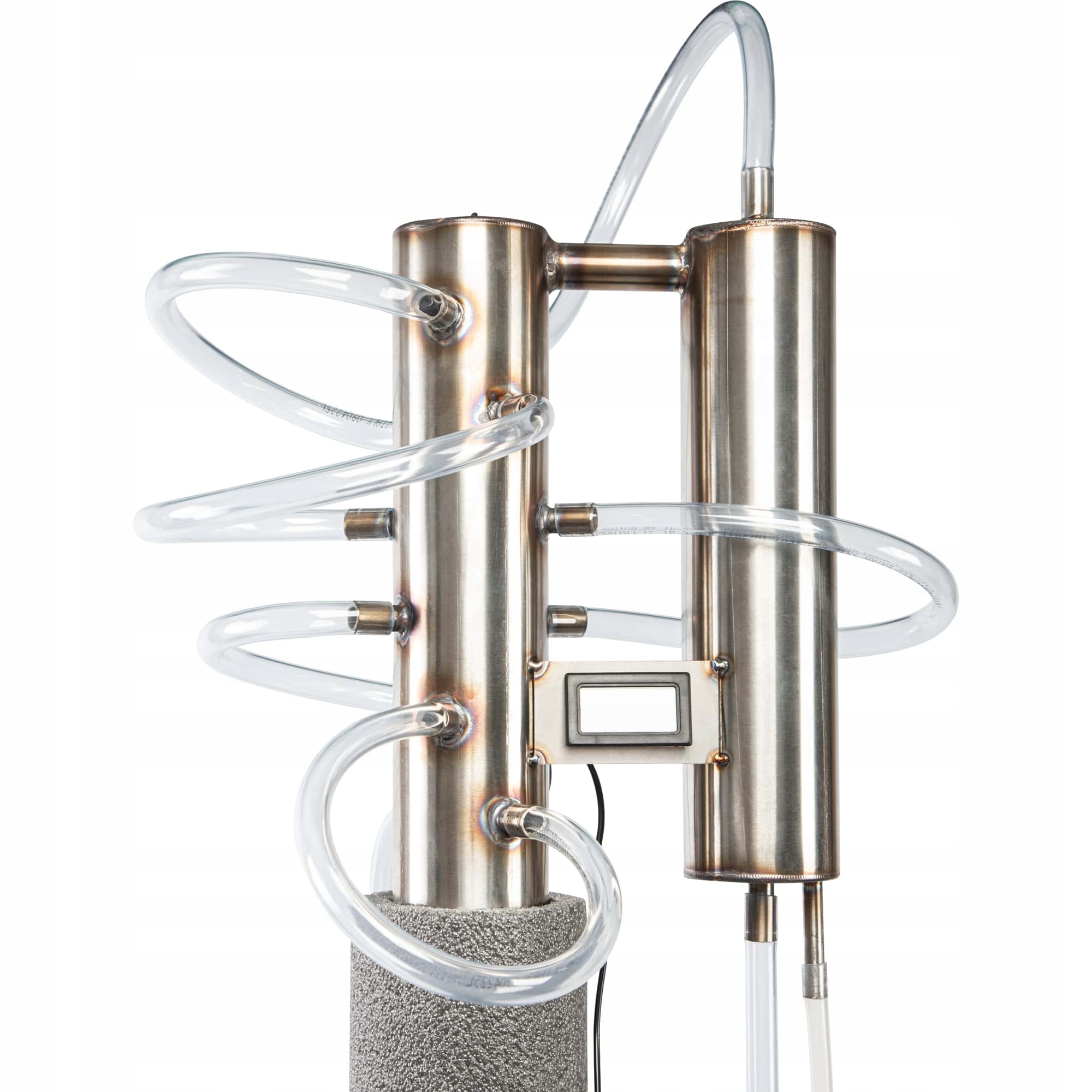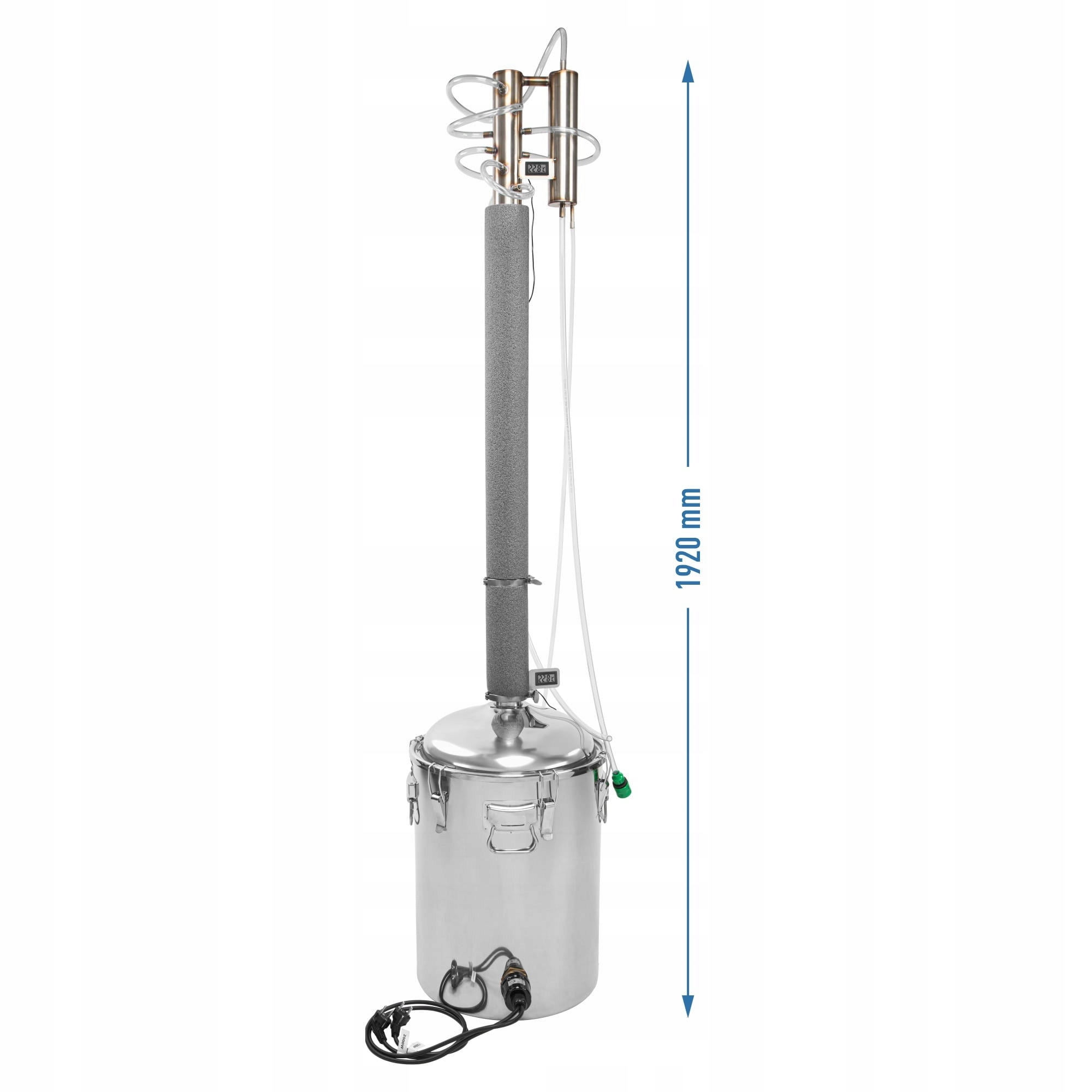 Весь комплект дополняет головка с охладителем, позволяющая эффективно конденсировать пары и контролировать температуру пара в верхней части колонны. Встроенный электронный термометр с зондом позволяет точно контролировать температуру процесса, что имеет решающее значение для получения ожидаемого эффекта дистилляции.