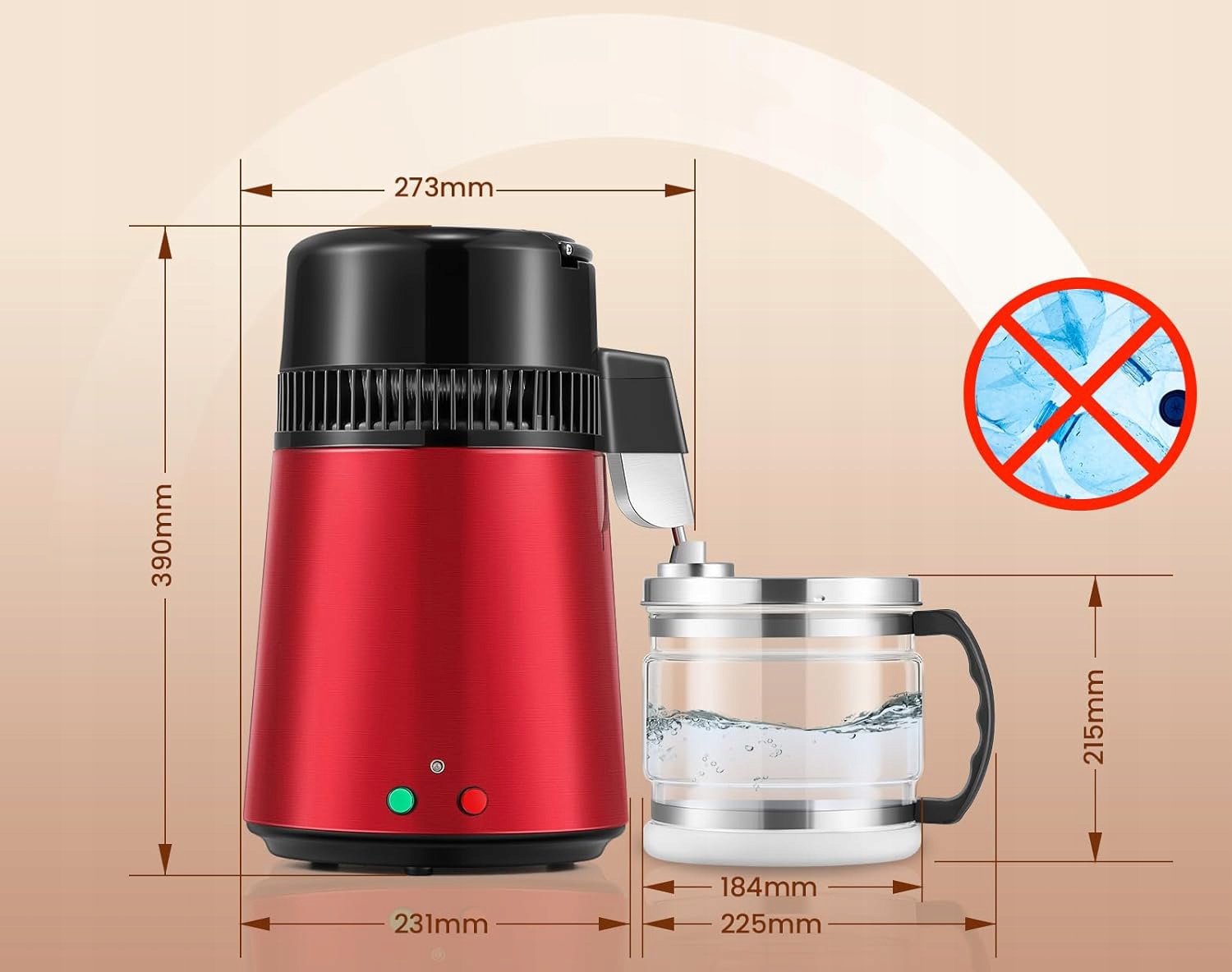 Встроенная нержавеющая сталь внутри дистиллятора гарантирует, что вода не контактирует с пластиковыми элементами, обеспечивая 100% чистоту конденсата. Благодаря отсутствию необходимости замены фильтров можно быстро и эффективно получать воду высокого качества. Дополнительно для улучшения вкуса на выходе воды можно разместить активированный уголь.