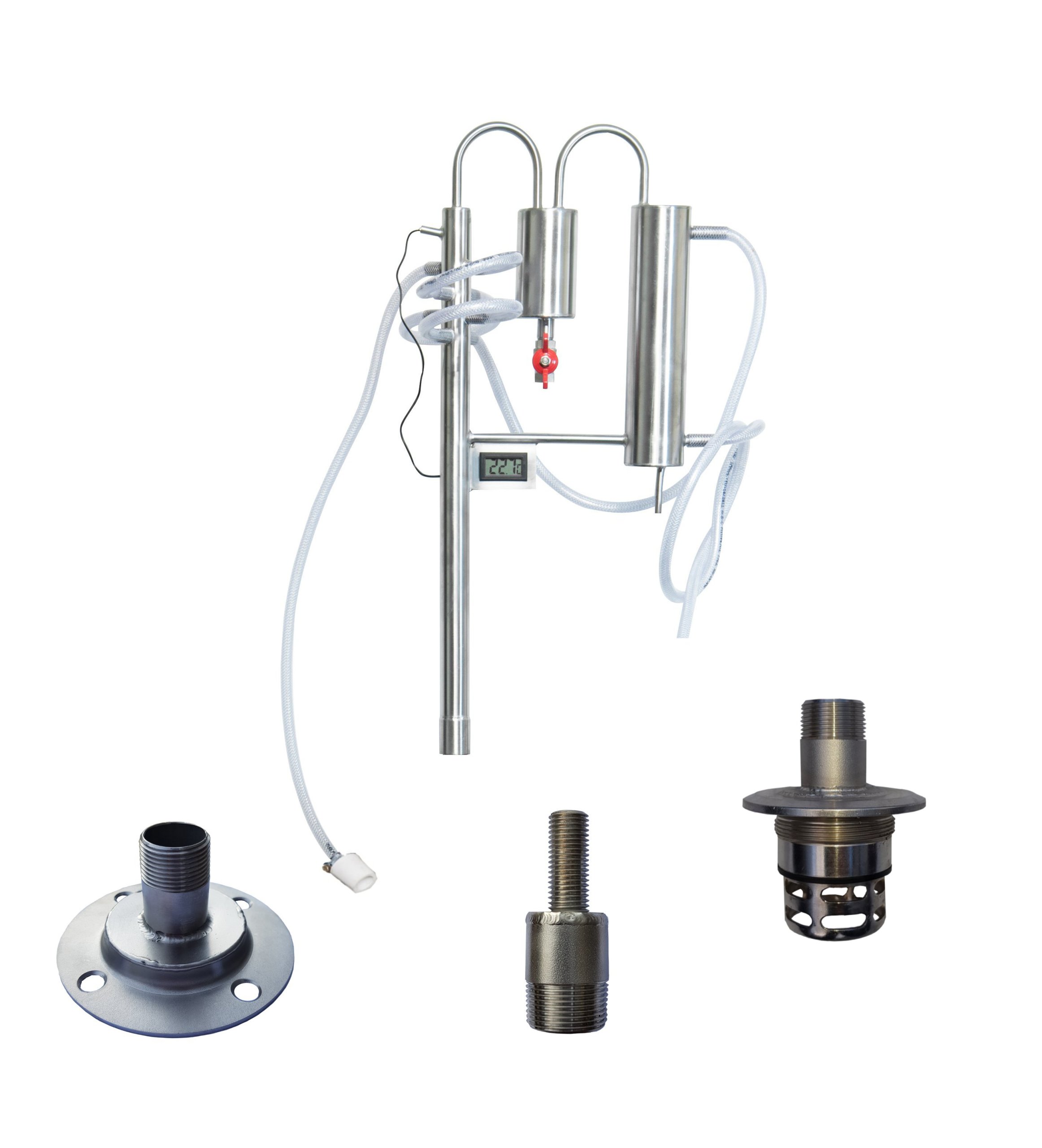 1. Электронный термометр с зондом, который вставляется в капилляр в верхней части колонки. Благодаря использованию термометра мы имеем полный контроль над температурой паров, поступающих в охладитель, что позволяет легче регулировать процент мощности конечного продукта.