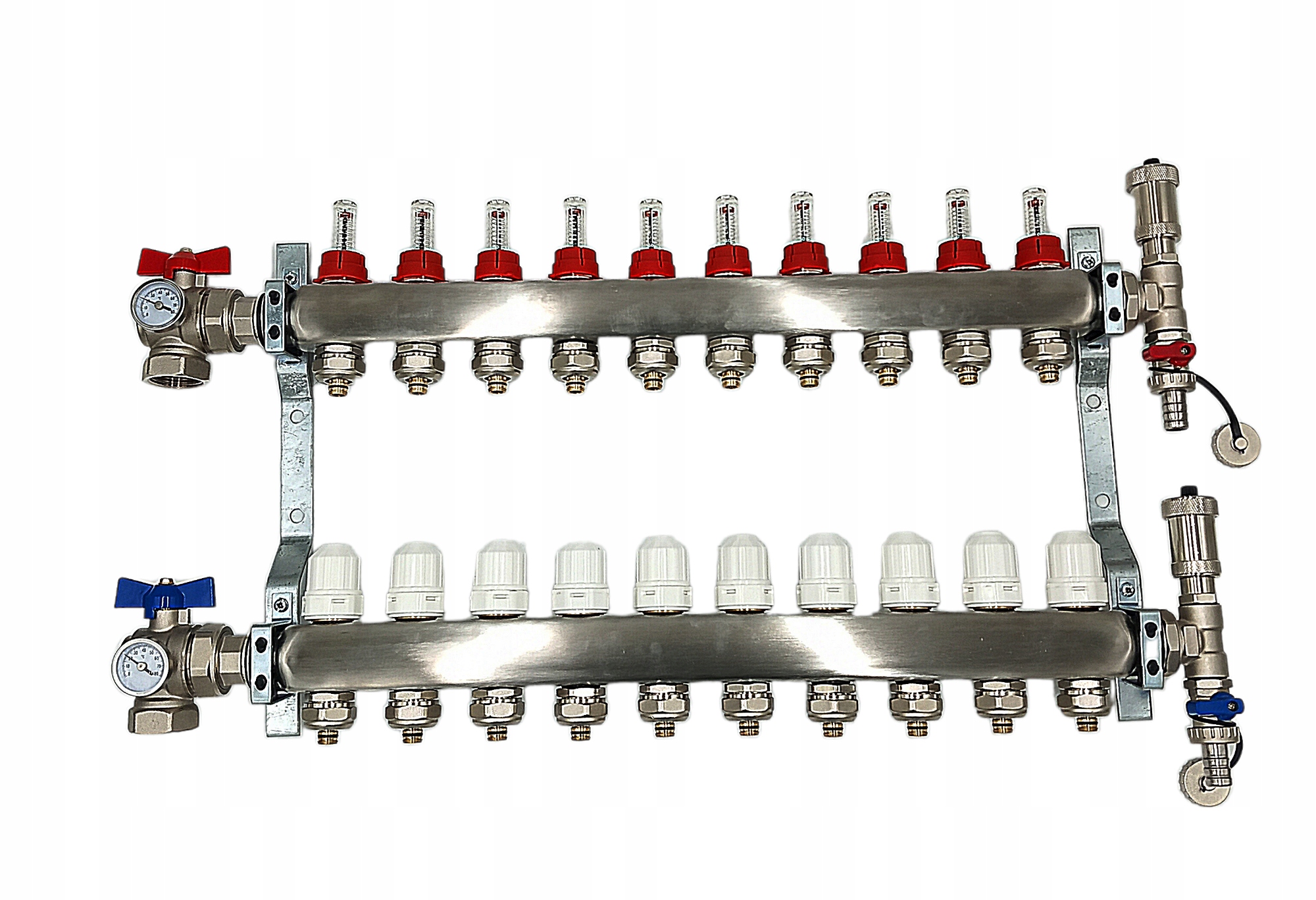 rowamer , также известный как регулятор нагрева под полосом, используется на балке питания. Ротаметрии используются для точной регулировки петли нагрева под нижней части. Вопреки внешности, правильная регуляция потоков и работа нашего подночного нагрева является задачей, занимающей много времени. Чтобы наша установка эффективно работала, необходимо правильно отрегулировать потоки. Сначала открутите терморегуляторные клапаны на обратной балке, а затем ротаметр, после удаления красного замка, дает нам возможность увеличить или уменьшить поток воды. Процесс регулировки состоит в уменьшении потока в более коротких петлях (с более низким сопротивлением потока) и увеличению потока в более длинных петлях (с более высоким сопротивлением). Счетчик потока имеет диапазон от 0 до 5 л/мин, но опыт показывает, что этот диапазон имеет значительный источник, поскольку значения, достигнутые в наших установках, составляют около 1-1,5 л/мин.