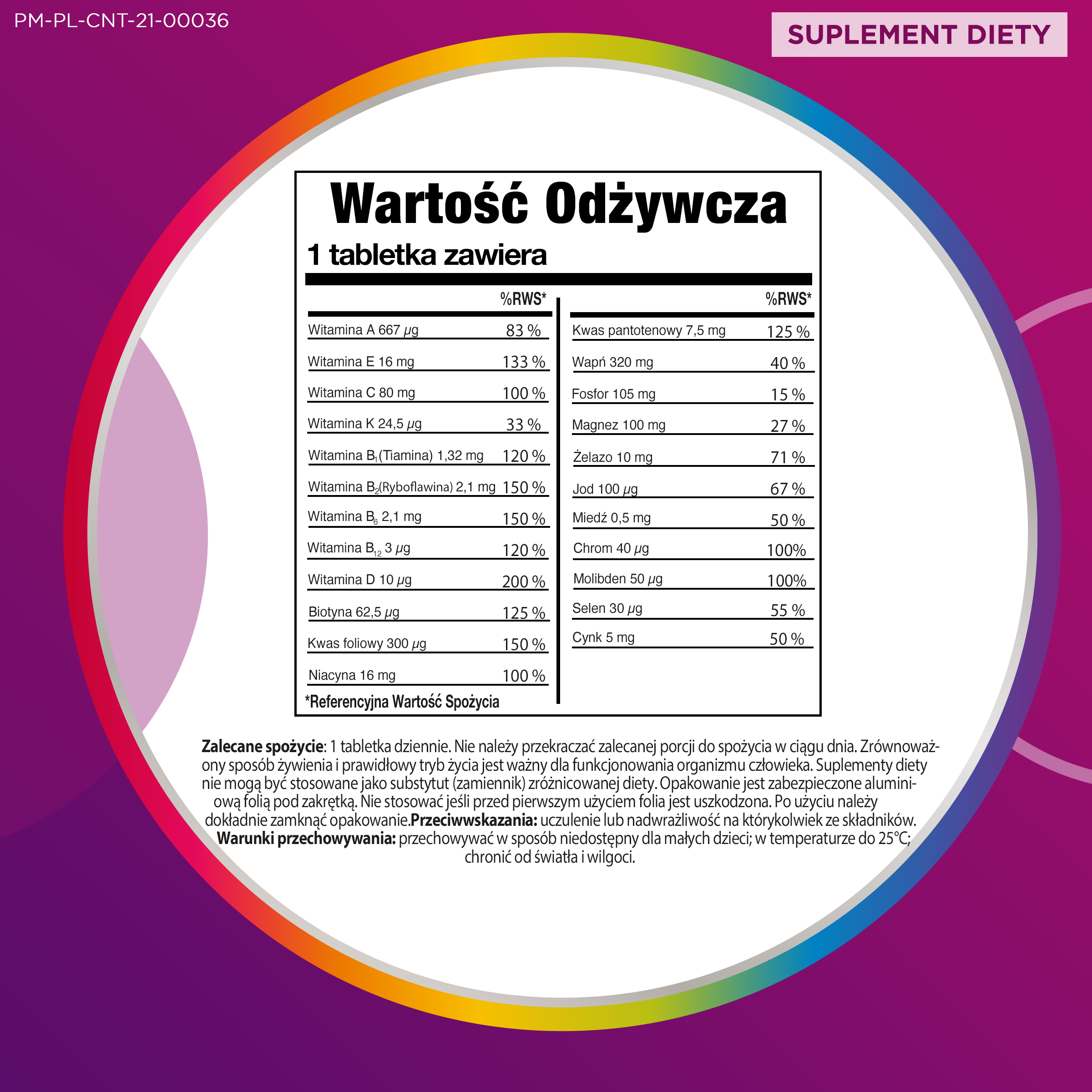 Состав: кальциевые соли ортофосфорной кислоты; карбонат кальция; оксид магния; наполнители: Е 460, Е 464, Е 1200; L-аскорбиновая кислота (витамин С); антислеживатели: Е 468, Е 551, Е 553б, Е 470б; фумарат железа(II); DL-альфа-токоферилацетат (витамин Е); амид никотиновой кислоты (ниацин); кальция D-пантотенат; оксид цинка; пиридоксина гидрохлорид (витамин В6); рибофлавин (витамин В2); тиамина мононитрат (витамин В1); растительное масло (кокосовое и пальмовое); бета-каротин (витамин А); сульфат меди(II); ретинилацетат (витамин А); птероилмоноглутаминовая кислота (фолиевая кислота); хлорид хрома(III); молибдат натрия; йодистый калий; селенит натрия; D-биотин; филлохинон (витамин К); холекальциферол (витамин D); цианокобаламин (витамин В12); красители: Е 120, Е 133.