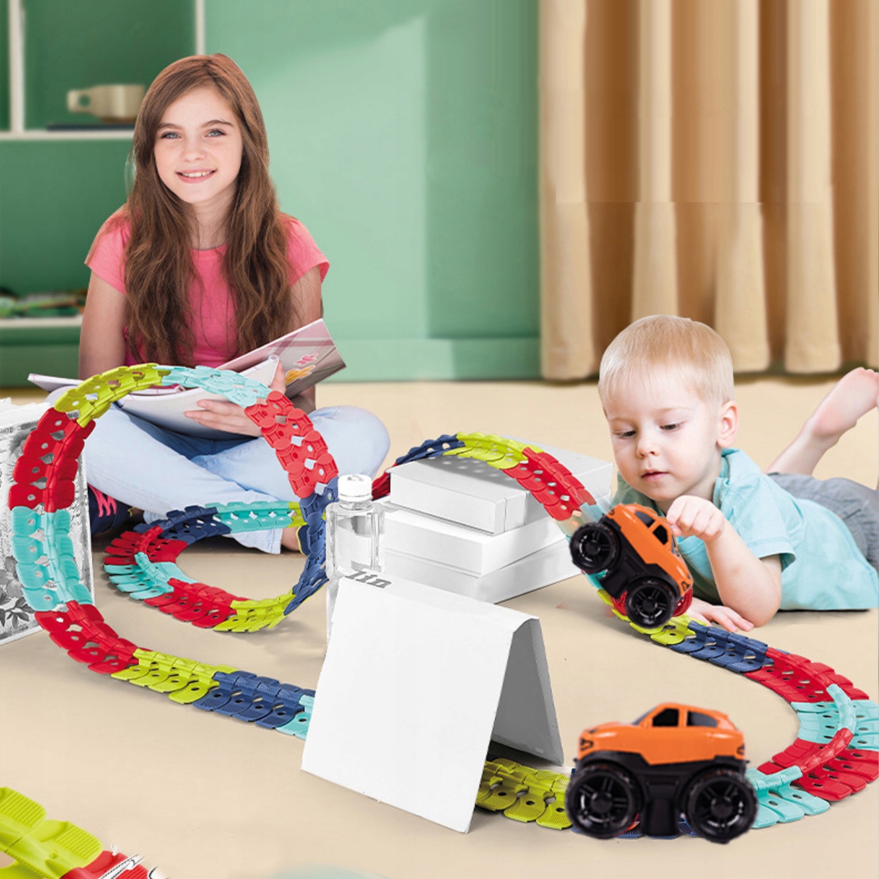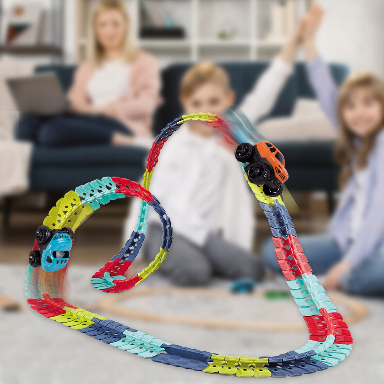Дорожка состоит из отдельных элементов, соединенных между собой с помощью системы кликов. При сборке элементов вы можете создать трассу любого цвета и свободно определять маршрут после сборки всех элементов. Конечно, вы можете расширить и увеличить трек, приобретя дополнительные комплекты.