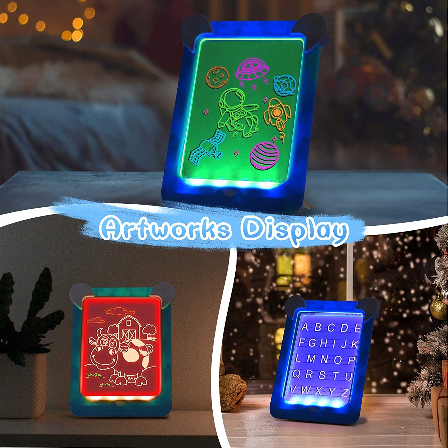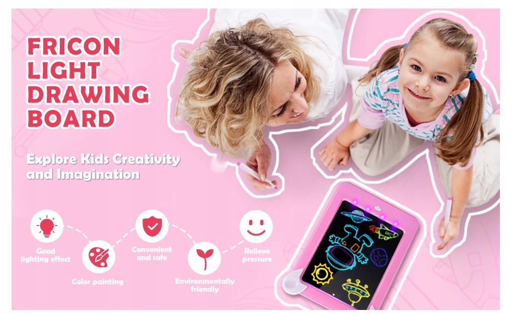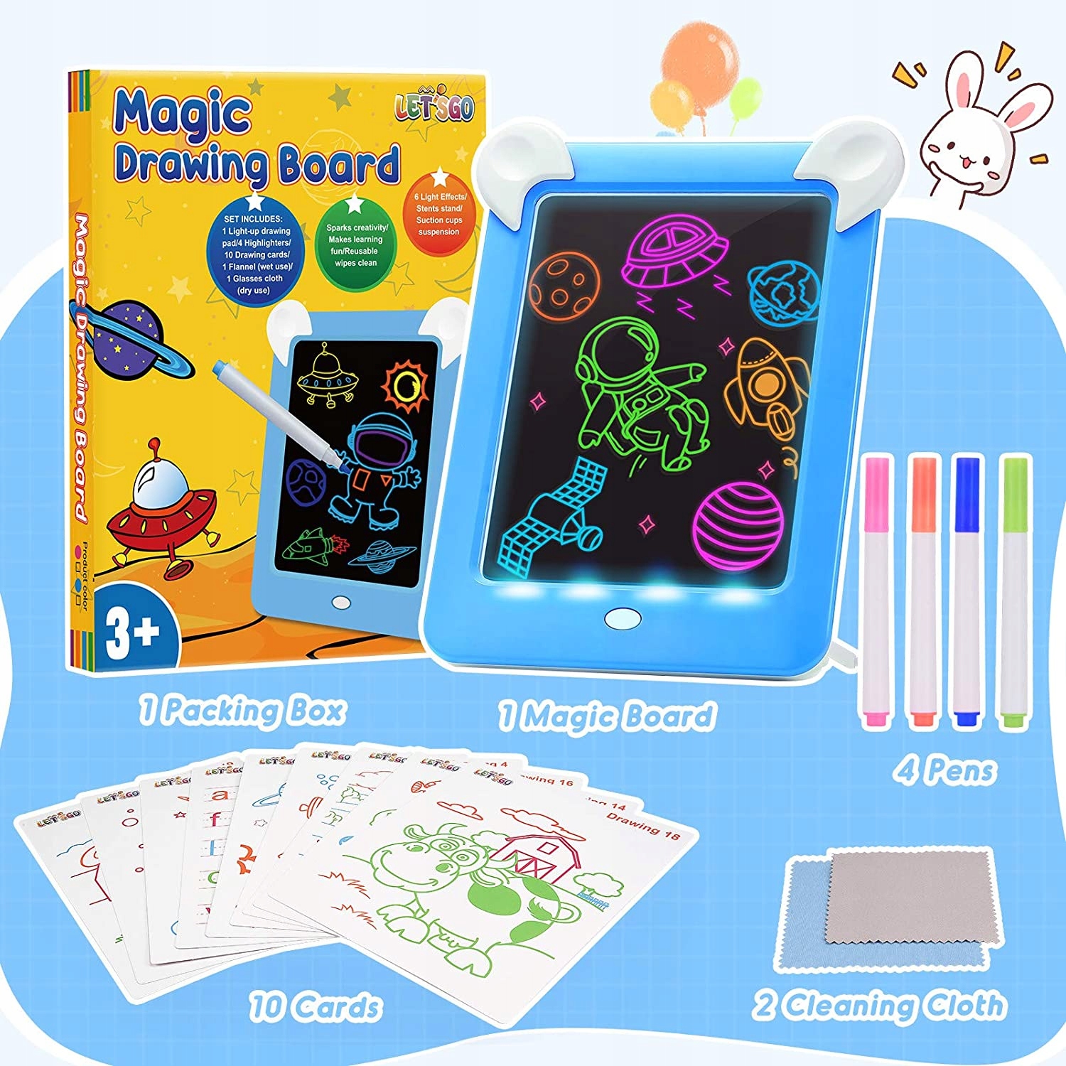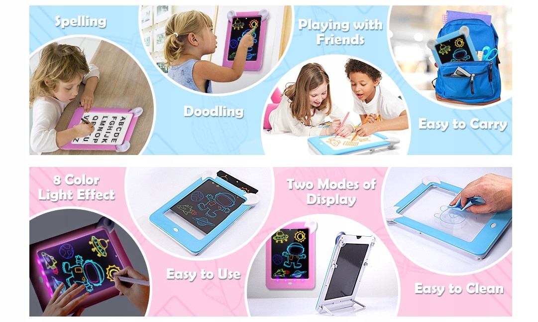 Предназначено для детей: 8 различных красочных световых эффектов, 10 листов бумаги, 4 ручки, 1 губка. Нетоксичный материал. Обеспечивает безопасное развлечение детей. Не беспокойтесь о том, что разноцветные ручки испортят одежду ваших детей.