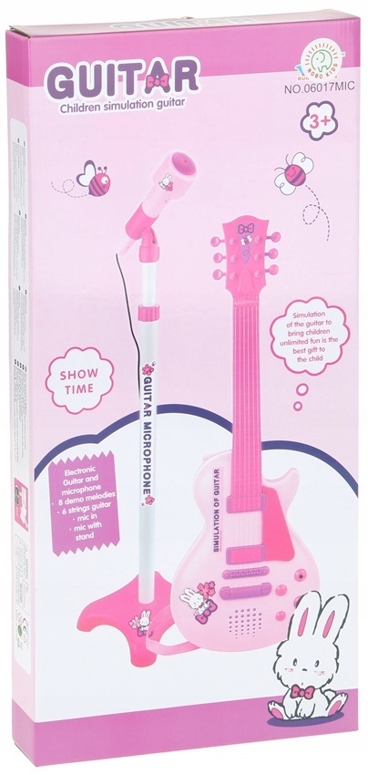 Электрогитара вызовет у детей желание создать собственную группу. Он выполнен из пластика, имеет металлические струны и кнопку с предварительно загруженными демо-песнями. В комплект также входит микрофон с подставкой, благодаря которому ребенок также сможет петь перед публикой. Подставку можно регулировать по высоте, что облегчит пение каждому ребенку.