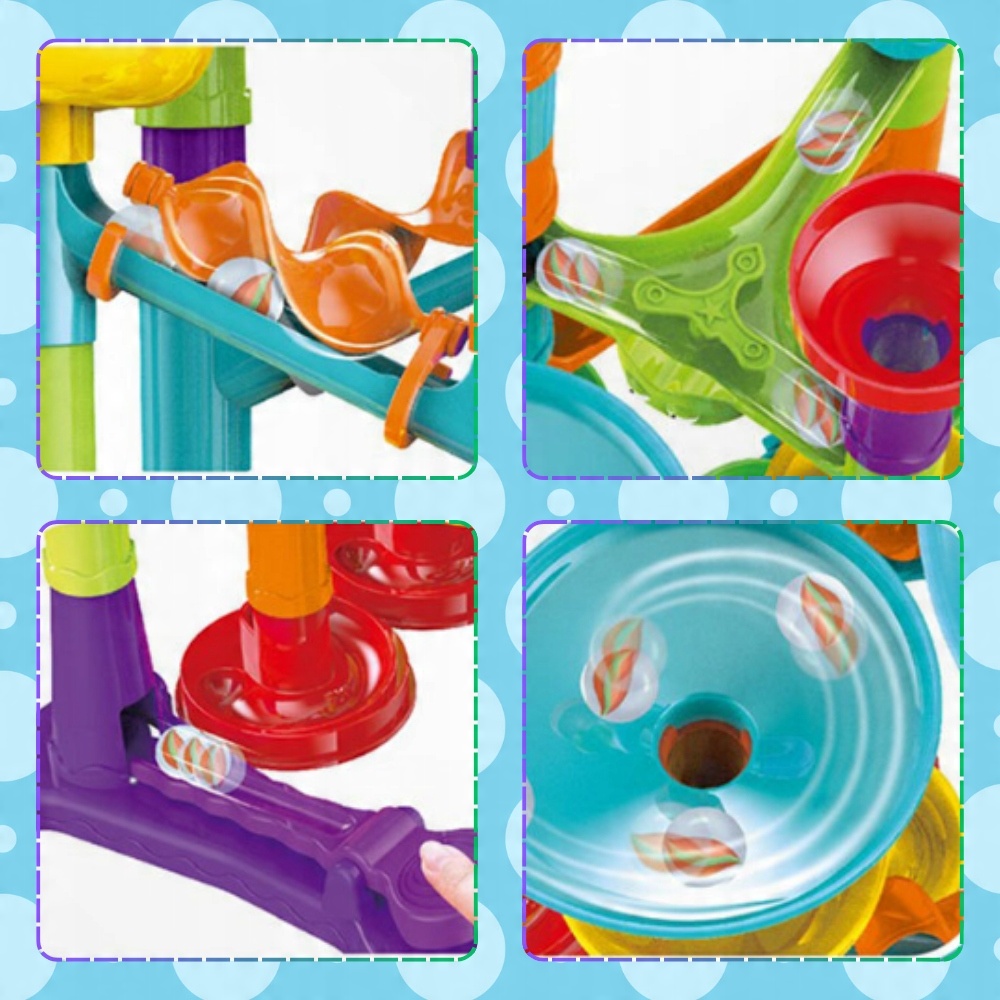 Набор шариковых дорожек позволяет детям строить и модифицировать свои собственные конструкции, создавая бесконечные комбинации маршрутов, что поддерживает их творческие способности и пространственное мышление.
