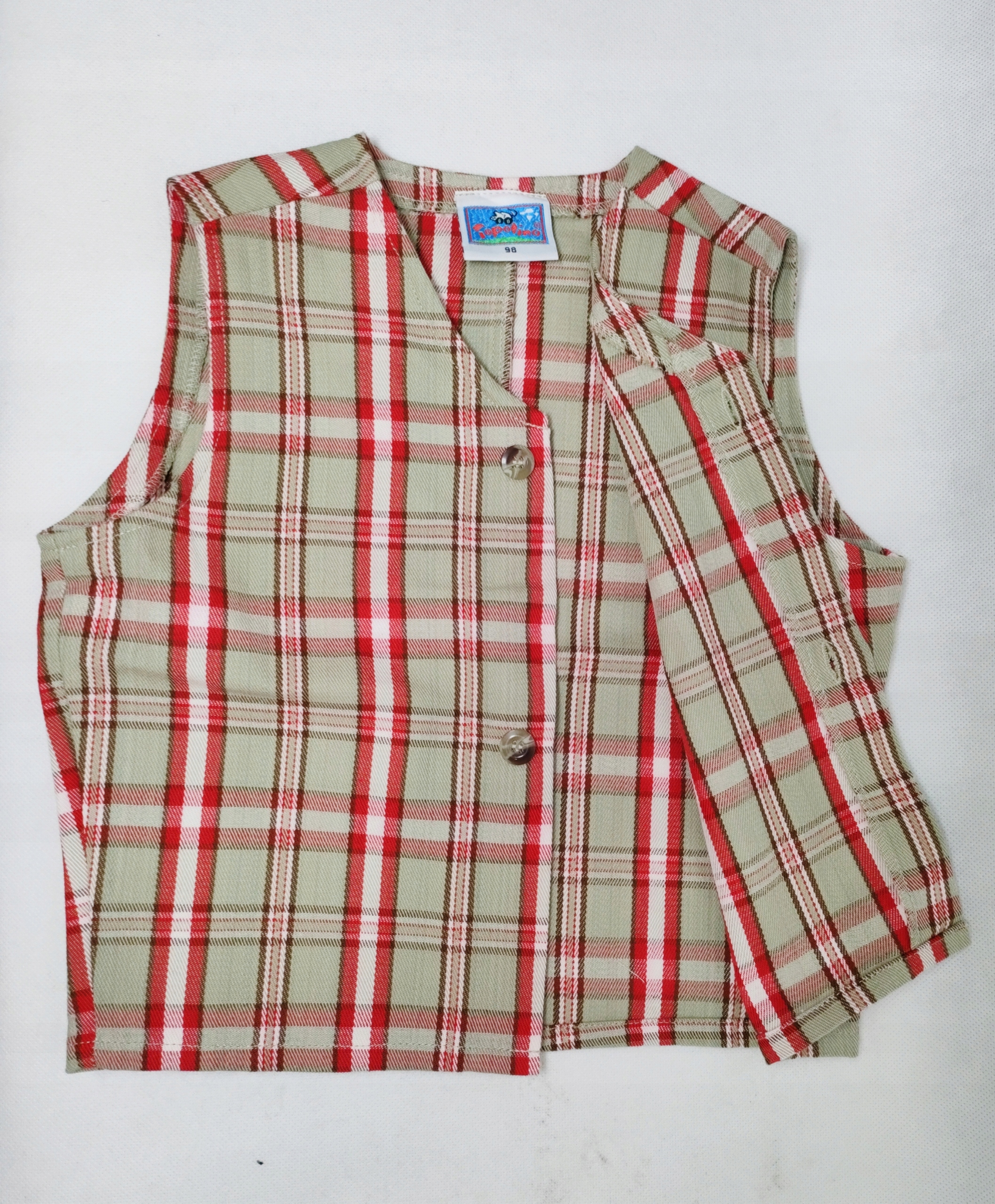 Бежевый детский хлопковый жилет в красную клетку. Рубашка застегивается на две пуговицы. ТОПОЛИНО жилет. Очень тщательно сделано. Новый без бирок, в выставочном состоянии.