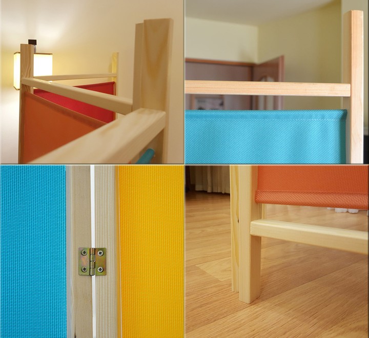 Разноцветная ширма для детской комнаты из натуральной древесины сосны и устойчивой к истиранию ткани.
