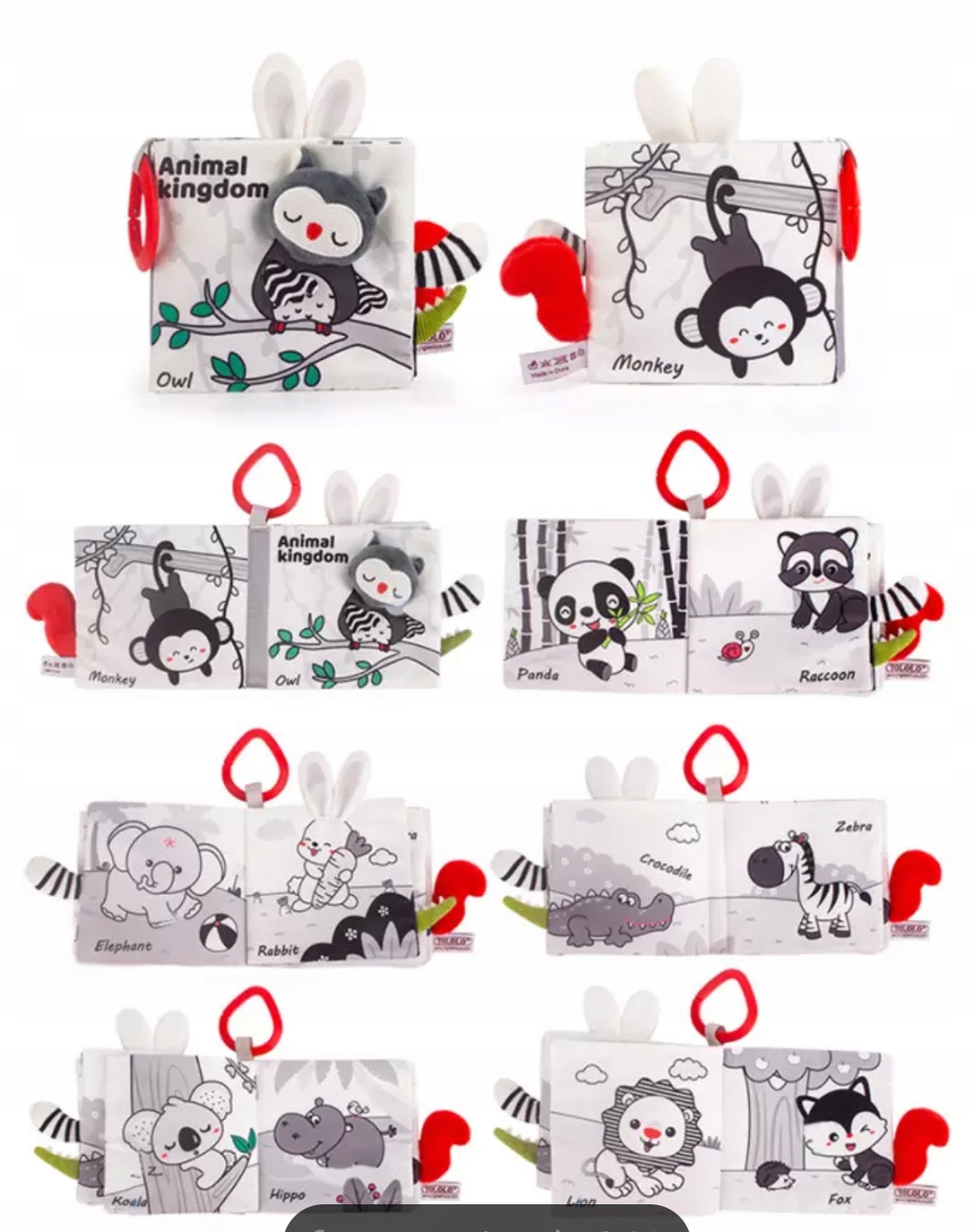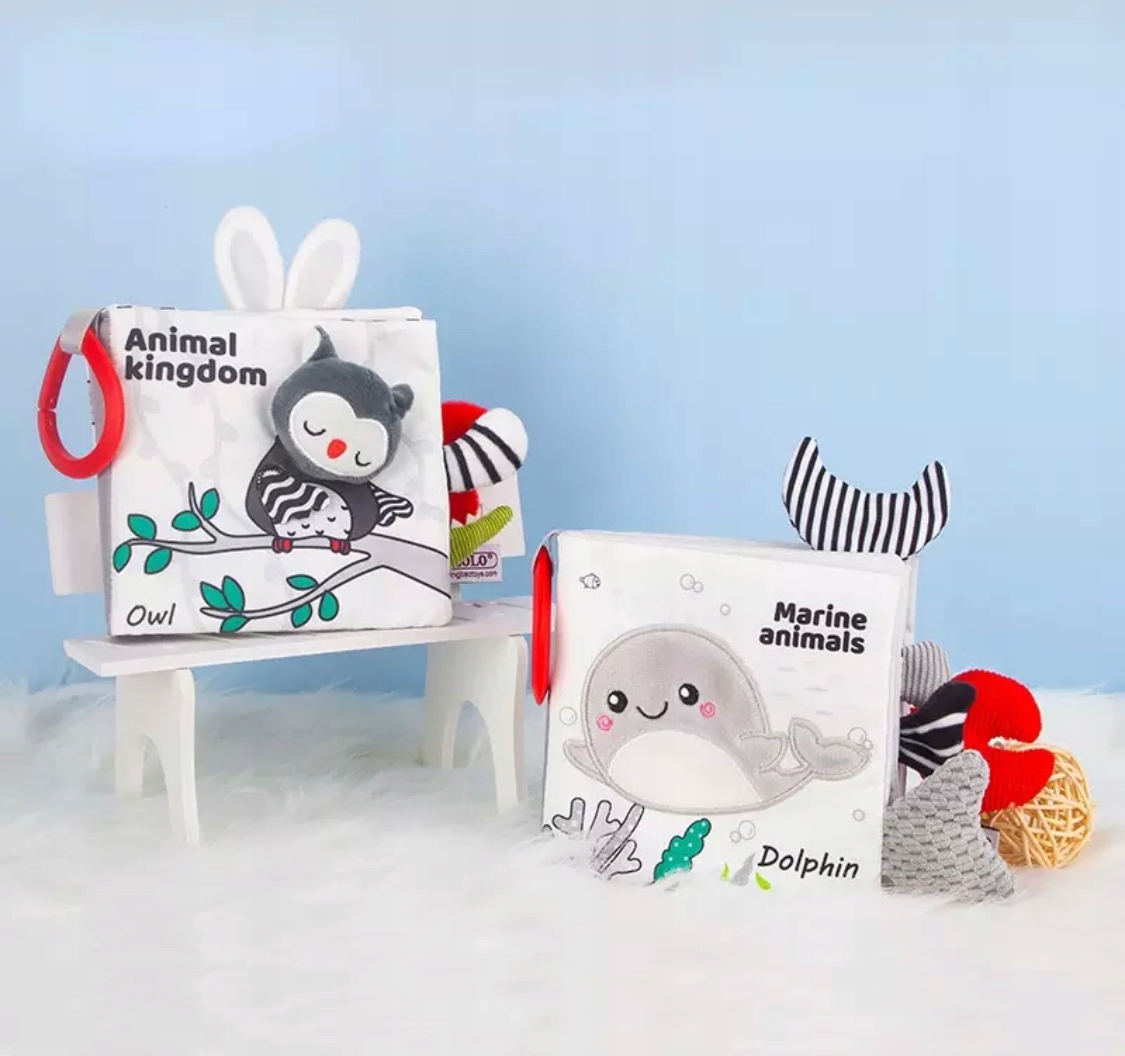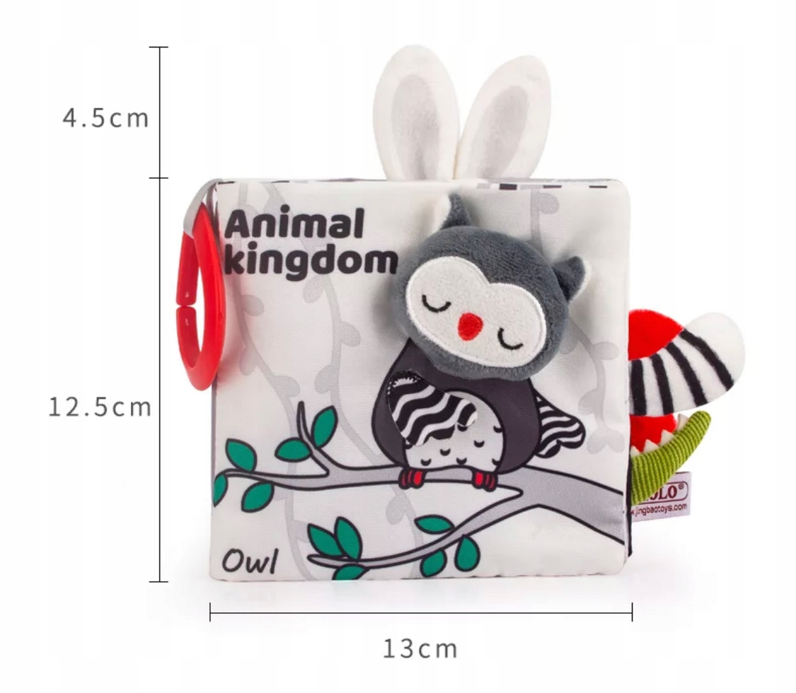 Он стимулирует воображение ребенка и побуждает его играть с такими аксессуарами, как: шуршащие элементы, контрастные иллюстрации, торчащие хвостики, различные текстуры, звуковые эффекты. и т. д.