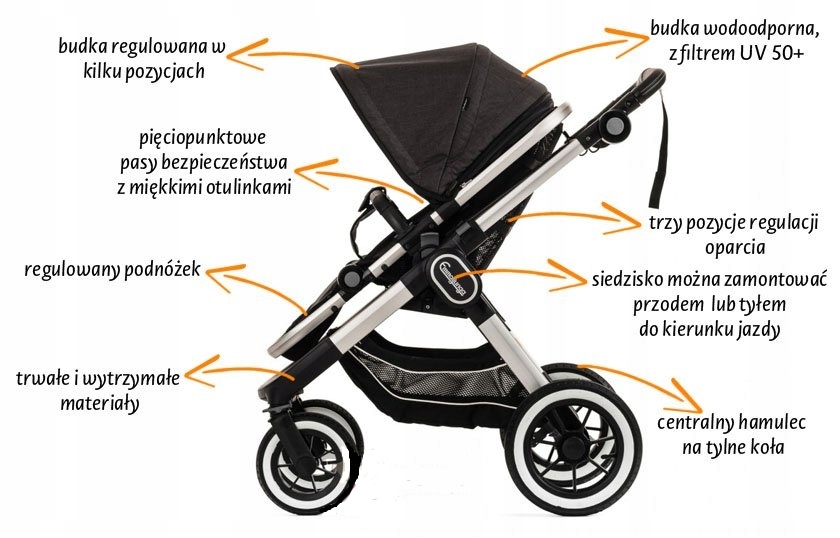 Коляска также имеетхорошую амортизацию, поворотные передние колеса и регулируемую ручку, которую можно регулировать в соответствии с потребностями родителей, как телескопическую, так и шарнирно-сочлененную.