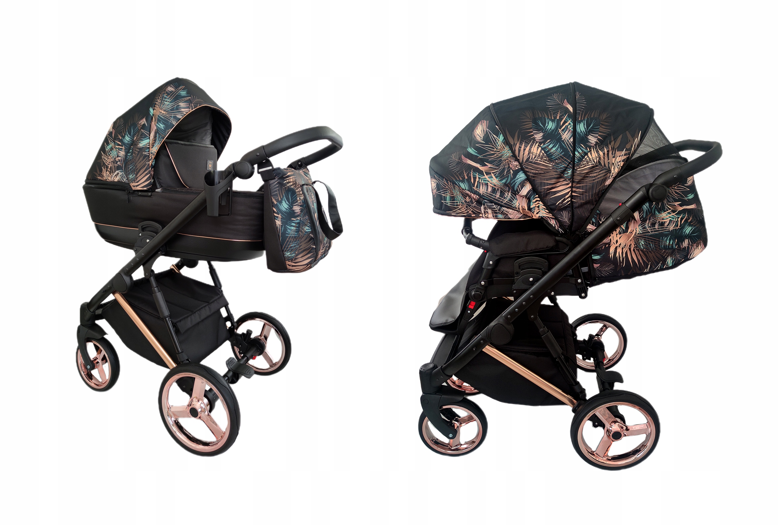 - Гондола, сиденье коляски устанавливается вперед или назад по направлению движения. Рама с колесами с добавлением золота, как на фото ниже.