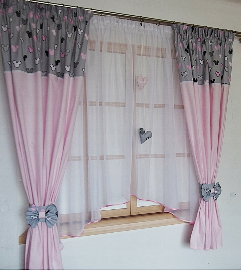шторы, сшитые от гладкого хлопка в цвете порошковой розовой с хлопковой вставкой с красочной мышей, готовой с деликатной короной. Каждый
