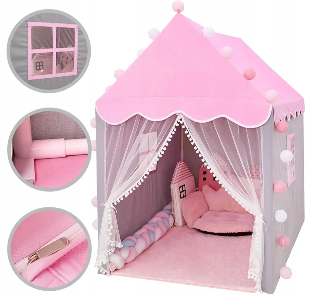 - МЕЧТА КАЖДОЙ ДЕВОЧКИ — палатка для детей — отличное развлечение на долгие часы. Тканевая детская палатка в форме домика – подарок-мечта для каждого ребенка. В детском домике 2окна с мелкой сеткой и удобный вход. В нем можно спрятаться с любимыми игрушками и дать волю своей фантазии. Дворец для детей станет идеальным местом для эмоциональных и творческих игр как дома, так и на природе – например, в саду, на пикнике, на террасе или на пляже