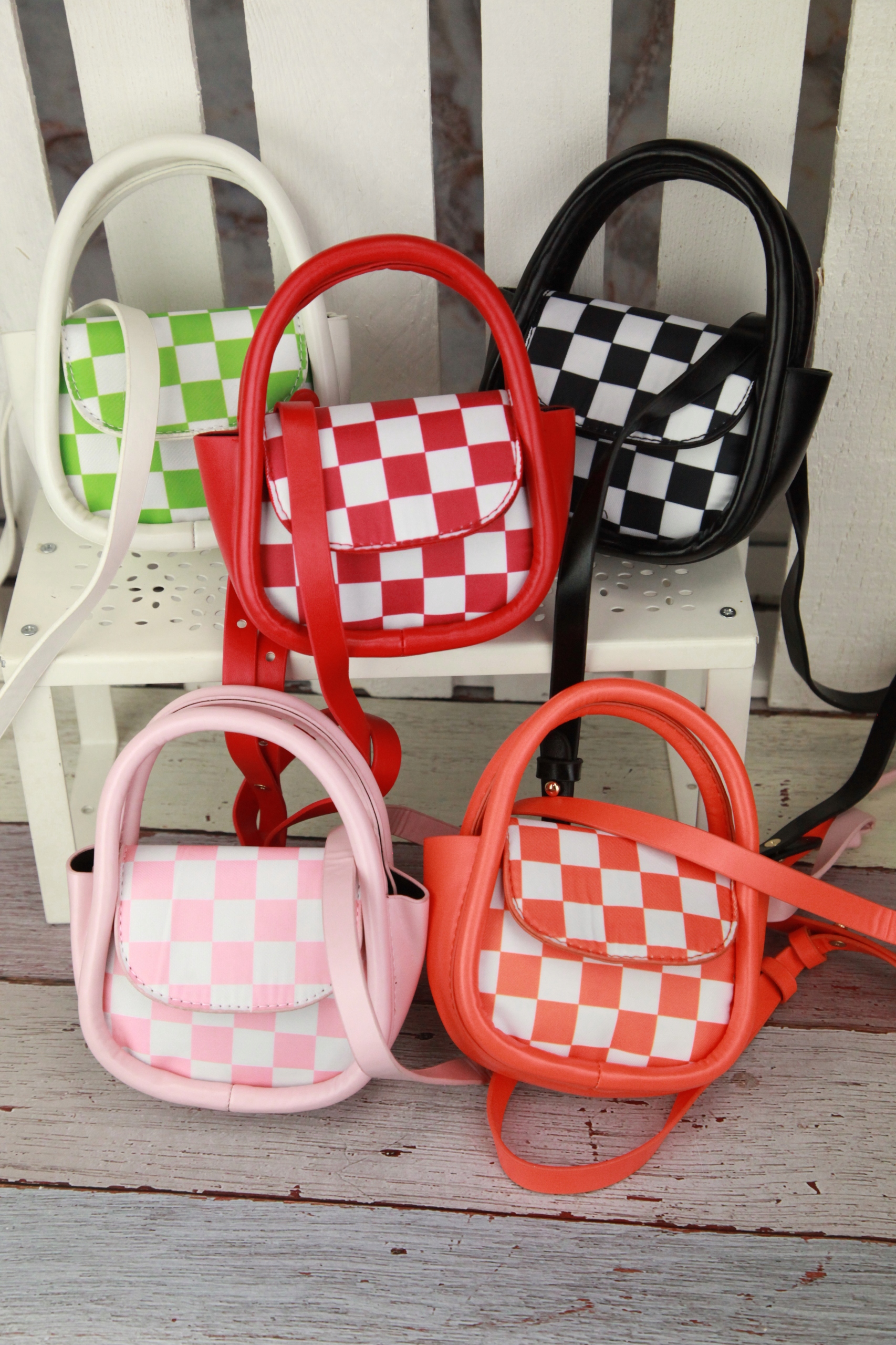 Очень оригинальная сумочка с клетчатым узором. Передняя часть сумки застегивается на кнопку. Кроме того, прилагаемый ремень позволяет носить сумку на плече или застегивать ее на талии.
