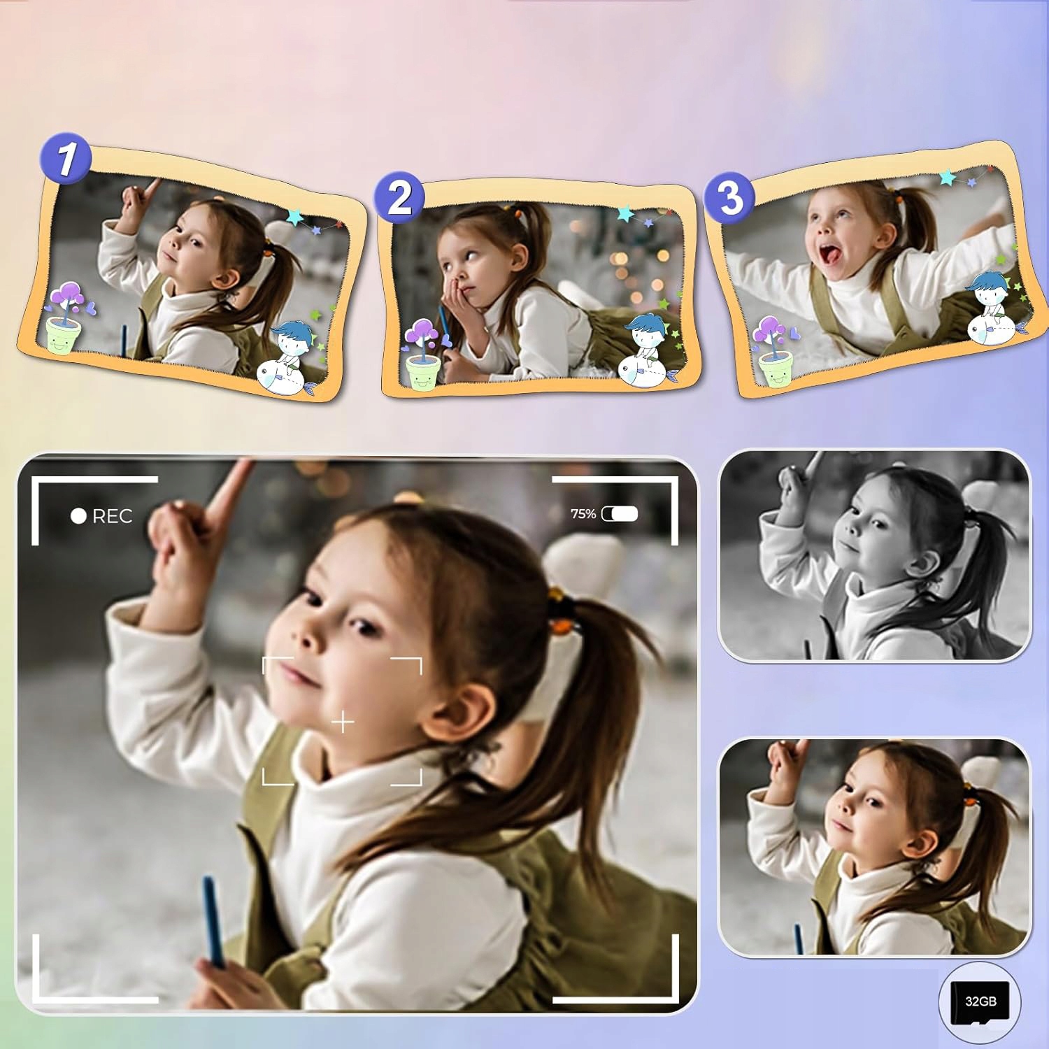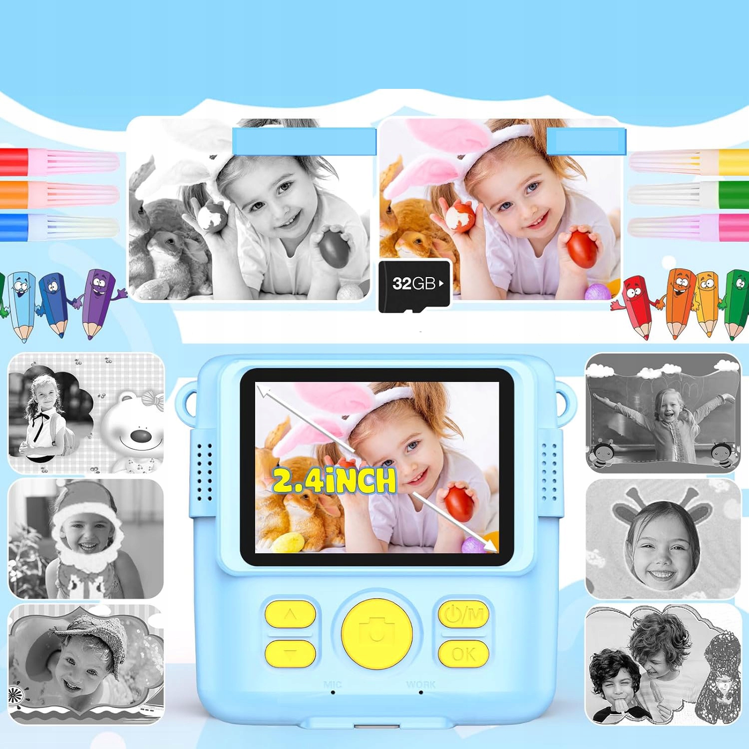 Ремешок одного цвета помогает детям брать камеру с собой куда угодно; Карту Micro SD на 32 ГБ не нужно приобретать отдельно; и 5 цветных карандашей позволяют детям дать волю своему воображению и творчеству на распечатанных черно-белых фотографиях. С 3 рулонами сертифицированной бумаги для термопечати дети могут использовать камеру моментальной печати прибл. 200 фотографий.