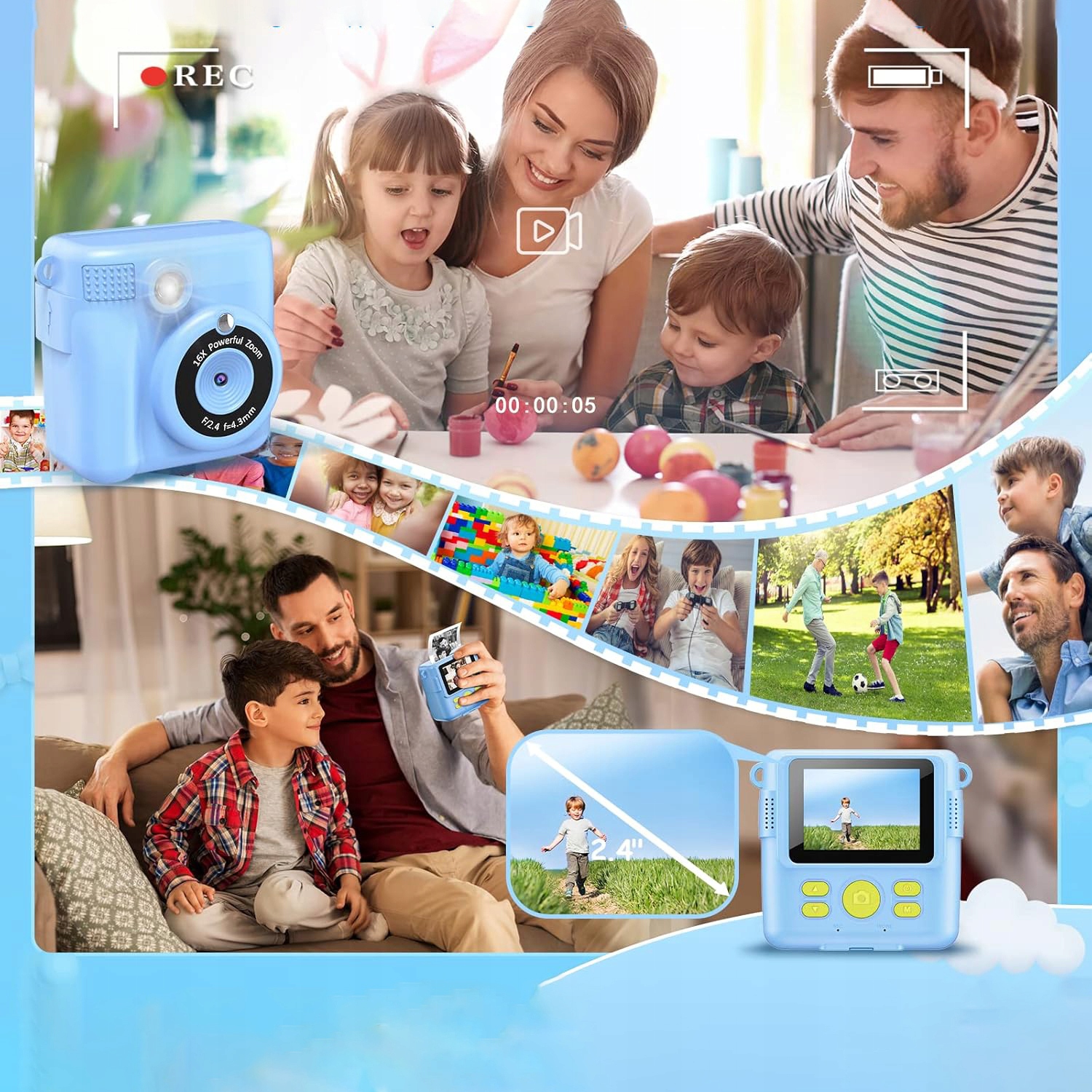 Эта детская камера с мгновенной печатью, большим экраном 2,4 дюйма, видео 1080P, 16-кратным цифровым зумом, вспышкой, функцией покадровой записи, серийной съемкой, играми, рамкой с фильтром, MP3. Это может удовлетворить различные потребности детей. Это хороший выбор, чтобы сопровождать своих детей, чтобы сделать их счастливыми. Подарите себе и своей семье приятные моменты.