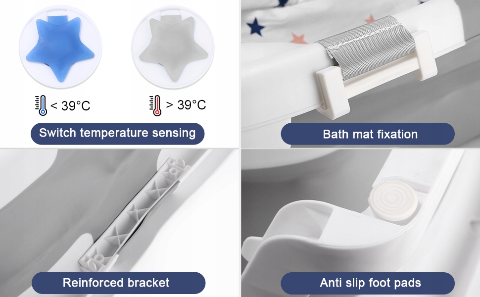 [Выключатель воды с датчиком температуры] Если температура воды, подаваемой в детскую ванночку, превышает 40°C, синий переключатель остановки воды в нижней части ванночки становится белым. Переключатель остановки воды не только быстро сливает воду, но и помогает вам раньше почувствовать температуру воды, чтобы вашему ребенку было комфортно купаться.