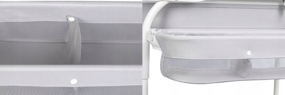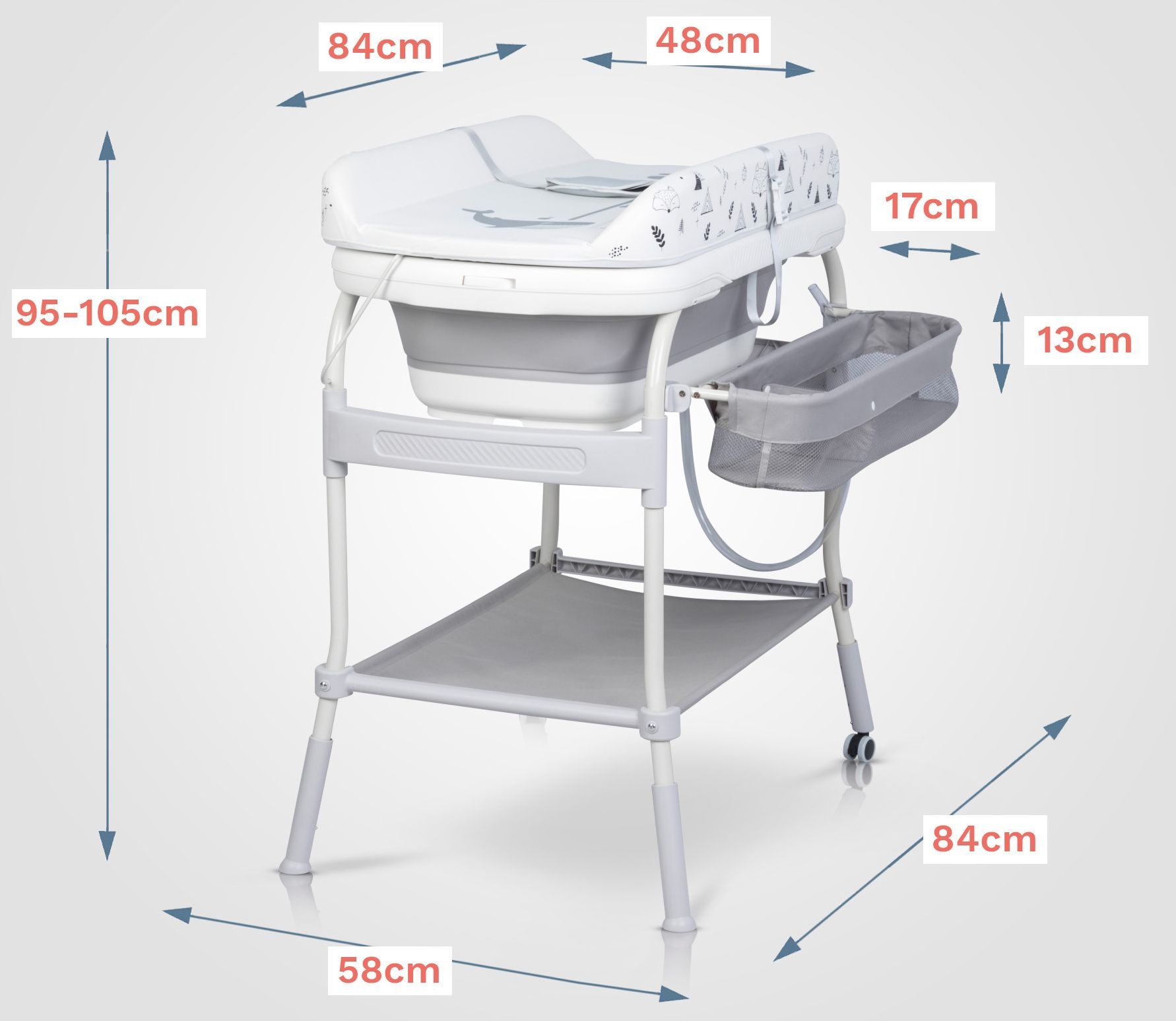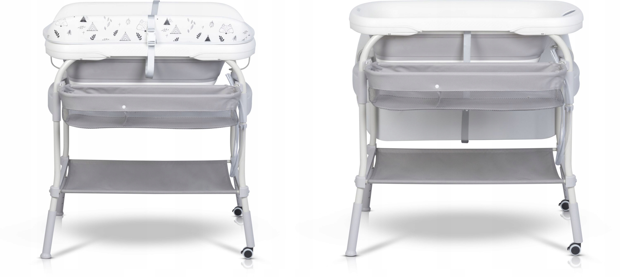 FLIP имеет устойчивую, удобную раму с двумя колесами и двумя стопорами, что делает его передвижение легким и приятным. Колеса имеют тормоза, поэтому независимо от того, используете ли вы функцию ванны или пеленального столика, вы можете быть уверены, что изделие устойчиво и безопасно. В нижней части расположена большая полка для таких вещей, как полотенце, а сбоку удобный органайзер, в котором можно разместить все купальные принадлежности или необходимые для смены подгузника ребенку.