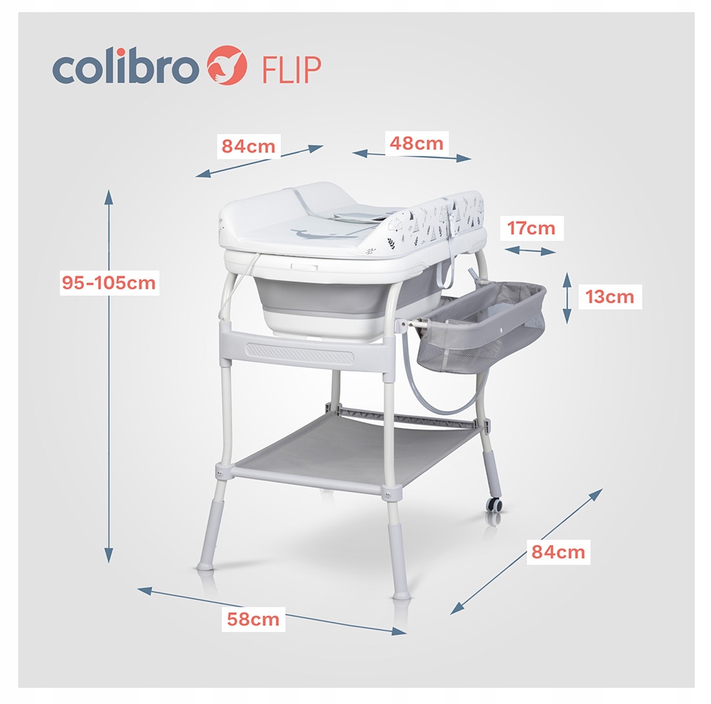 Flip имеет стабильную удобную раму с двумя колесами и двумя стопперы, что делает его легким и приятным. Колеса имеют тормоза, поэтому независимо от того, используете ли вы функцию ванны или изменяющегося стола, вы можете быть уверены, что продукт стабилен и безопасен. В нижней части есть большая полка для таких предметов, как даже полотенце, и удобный организатор на стороне, в котором все купальные посуды или те, которые необходимы для перемотки ребенка.
