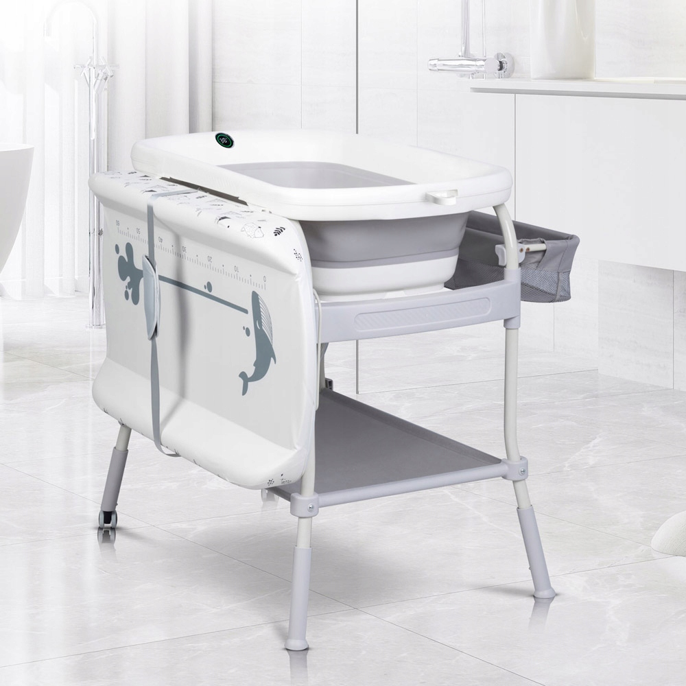 В нижней части имеется представляет собой большую полку для таких вещей, как полотенце, а сбоку удобный органайзер, в котором можно разместить все банные принадлежности или принадлежности, необходимые для смены подгузника ребенку.