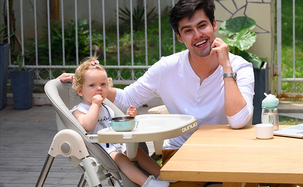 OUNUO Стульчик для кормления имеет практичный регулируемый двойной поднос, который можно легко снять. Это особенно полезно, если вы хотите подтолкнуть ребенка прямо к обеденному столу или поставить поднос в посудомоечную машину.