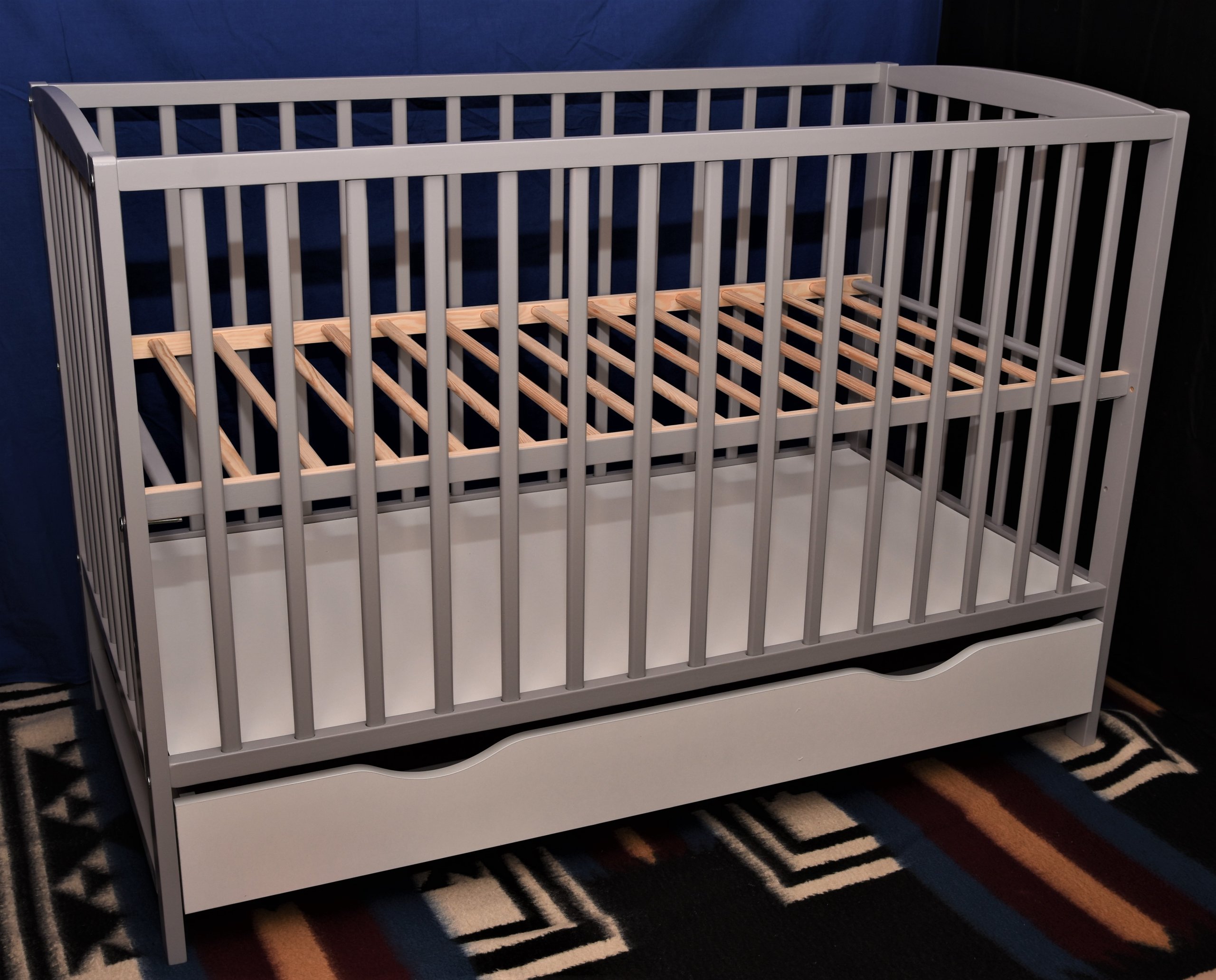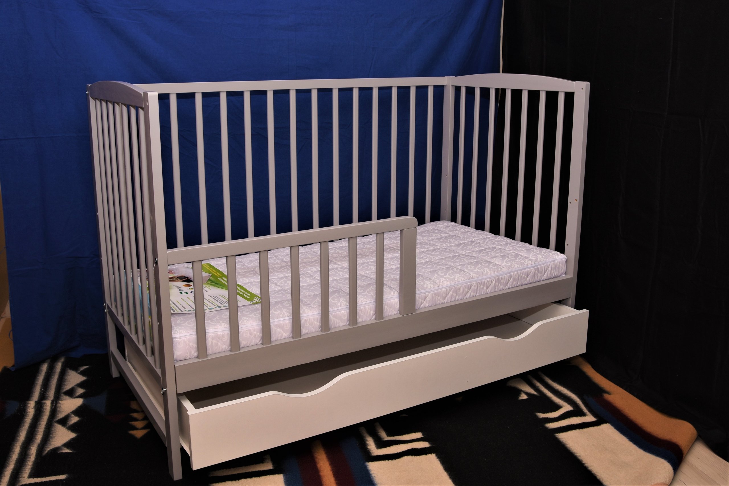 Кровать изготовлена из древесины сосны 1-го сорта, с возможностью переоборудования в лежанку для ребенка постарше. снимаем боковину и устанавливаем безопасную «лесенку» (защита лестницы входит в комплект), а ящик выполнен из мебельного щита, покрытого нетоксичными красками и сертифицированными лаками.
