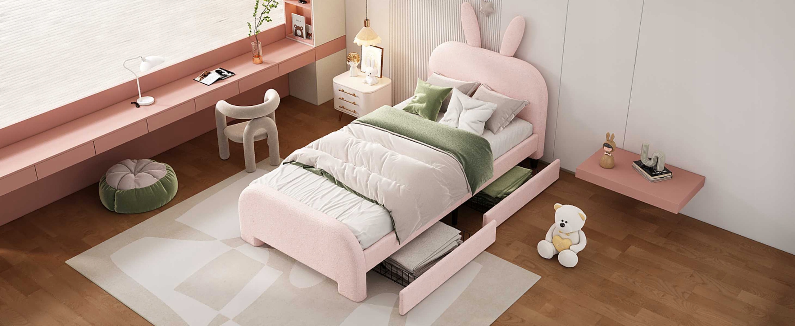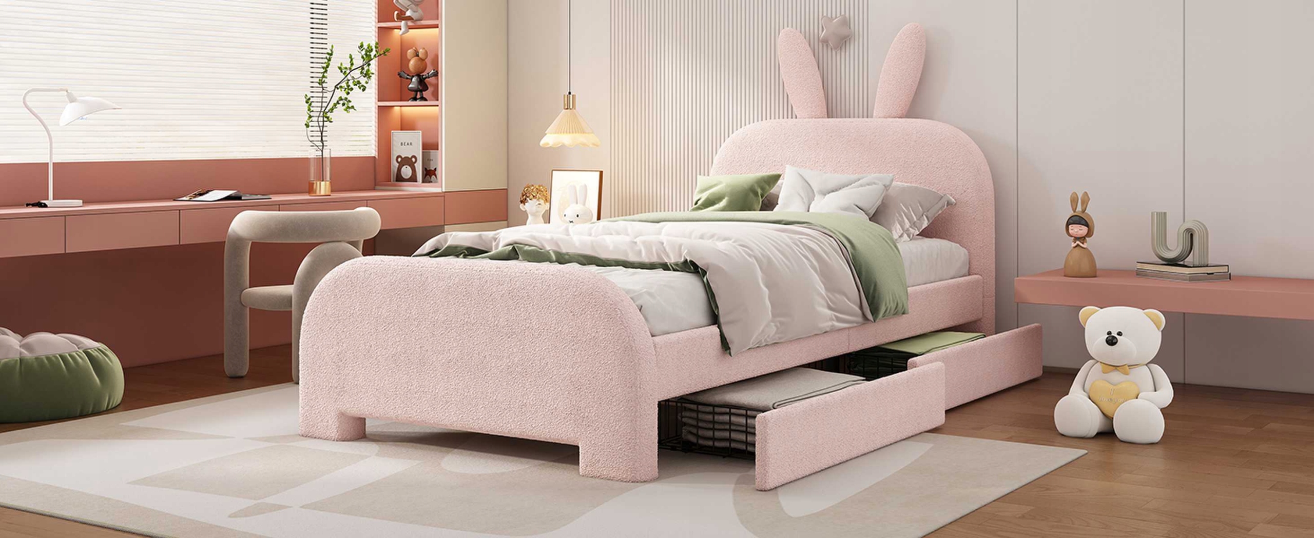 - из овечьей шерсти и MDF, кровать мягкая и долговечная, что обеспечивает комфорт и долговечность. Мягкий дизайн изголовья в форме кролика на рисунке полон детского цвета и очень любит дети. Кроме того, под кроватью есть два ящика, обеспечивающие удобное хранение и выращивание аккуратных привычек. Общий дизайн прост и мод, который может украсить детские комнаты и сопровождать детей в счастливом взрослении. Эта кровать представляет собой не только украшение дома, но и рай для детей.
